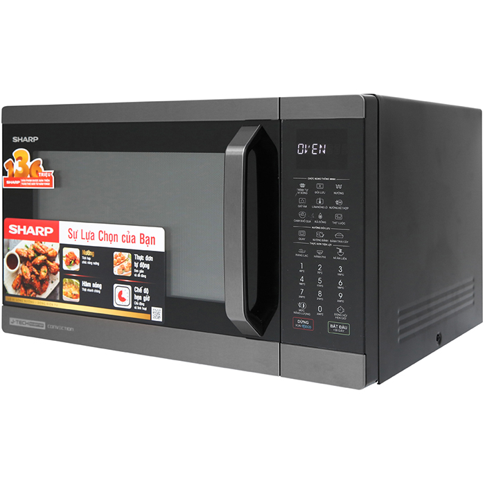 Thiết kế nhỏ gọn, dễ lắp đặt Lò Vi Sóng Điện Tử Có Nướng Đối Lưu Sharp R-C932XVN-BST có kích cỡ nhỏ gọn, không cồng kềnh, giúp dễ dàng lắp đặt trên gian bếp nhà bạn. Vỏ ngoài lò vi sóng phủ sơn tĩnh điện bền màu, dễ dàng lau chùi.  Với kích thước này bạn có thể đặt lò ở bất cứ đâu trong căn bếp nhà mình. Dung tích lò 32L Lò có dung tích 32L và không gian bên trong lò rộng rãi, có thể dễ dàng hâm thức ăn trong các hộp đựng thức ăn với kích thước khác nhau hoặc nồi thủy tinh cao cấp. Bên trong khoang lò tráng men chống dính, hạn chế bám bẩn, giúp bạn dễ dàng vệ sinh. Đĩa xoay giúp các món ăn được nấu chín đều, ngon, đèn chiếu sáng giúp bạn theo dõi quá trình chế biến bên trong lò. Cửa lò bằng kính chịu nhiệt cao cấp Công suất nướng lớn Sharp R-C932XVN-BST có công suất nướng đối lưu 2500W, sẽ giúp bạn nướng nhanh và nướng cùng lúc nhiều thức ăn. Hơn vậy, lò nướng còn có 11 mức công suất khác nhau để lựa chọn cho từng món ăn, chức năng hẹn giờ nấu sẽ giúp bạn an tâm hơn nếu công việc nội trợ quá bận rộn. Ngoài ra, chế độ J-Tech Inverter giúp máy tiết kiệm điện năng tiêu thụ. Lò vi sóng có nướng Lò vi sóng Sharp R-C932XVN-BST có tích hợp chế độ nướng hỗ trợ bạn làm các món nướng thơm ngon mà không cần dùng lò nướng. Đây là kiểu nấu nướng hỗn hợp kết hợp năng lượng nấu vi sóng và chức năng nướng để món ăn có vỏ bên ngoài vàng giòn, bên trong chín mềm.  Nhiều chế độ nấu ăn Lò vi sóng Sharp R-C932XVN-BST tích hợp nhiều chức năng nấu nướng tiện lợi, với các chức năng chính là nấu vi sóng, hâm nóng, rã đông, nướng, nướng kết hợp (gồm vi sóng và nướng).  Ngoài ra, bạn có thể cài hẹn giờ tối đa lên đến 99 phút 90 giây để lò vi sóng tự hoạt động và ngắt điện sau nấu ăn xong, không cần tốn thời gian canh lò mà vẫn không sợ thức ăn bị cháy. Bảng điều khiển dễ dàng điều chỉnh Được trang bị bảng điều khiển điện tử cùng màn hình hiển thị 4 số to, rõ, dễ thao tác, theo dõi quá trình lò hoạt động, giúp người dùng mau chóng chọn các chế độ nấu nướng hay hẹn giờ để tranh thủ làm việc khác. Bên cạnh đó, bảng điều khiển hỗ trợ ngôn ngữ Tiếng Anh và Tiếng Việt giúp bạn dễ dàng thao tác trong suốt quá trình sử dụng.