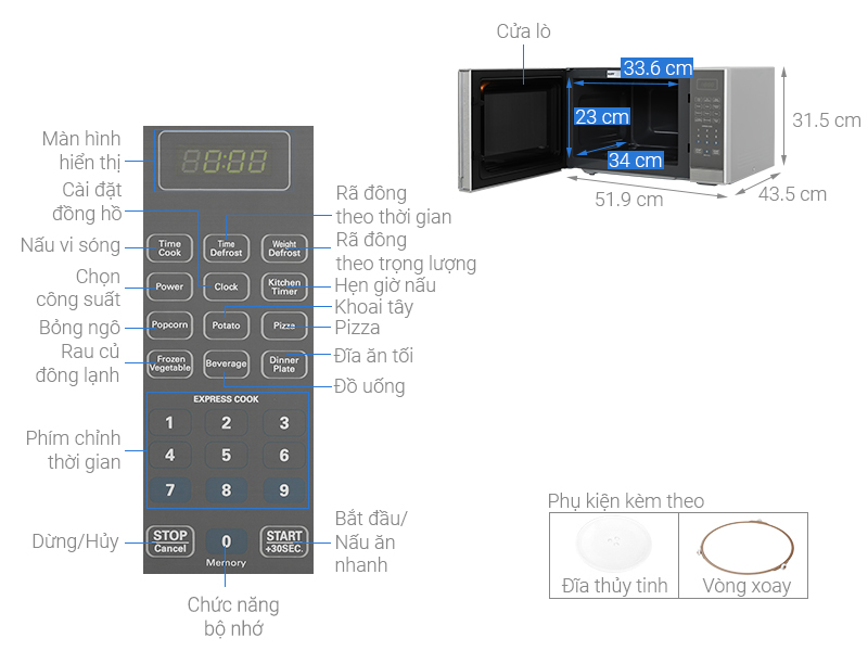 Lò vi sóng dung tích 20 lít, có thể bỏ vừa gà nguyên con 1kg Công suất vi sóng tối đa 1270W, nướng tới 1000W nấu nhanh Lò vi sóng có 4 chức năng chính: