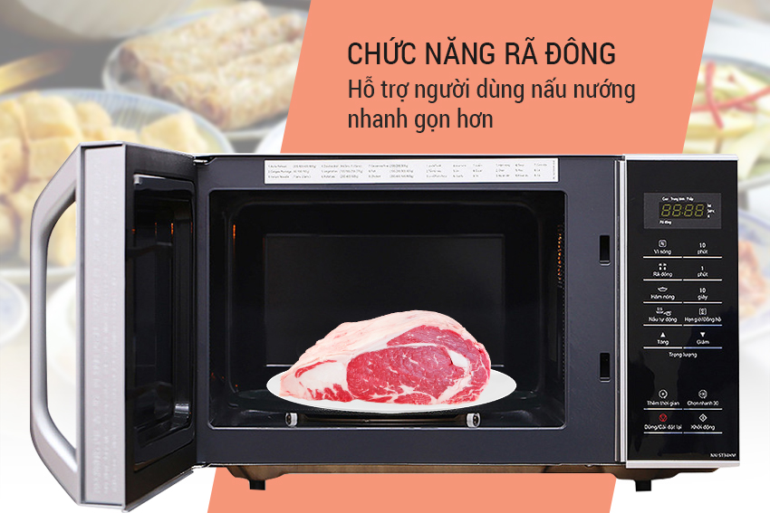 Thiết kế đơn giản Lò Vi Sóng Panasonic NN-ST34HMYUE có kiểu dáng đơn giản, trang nhã cùng với dung tích lò lên đến 25L, thích hợp cho những gia đình 4 - 5 người. Chất liệu cao cấp Sản phẩm có khoang lò được làm bằng thép tráng men bền đẹp, dễ chùi rửa và mặt cửa kính cường lực chịu nhiệt cao cấp, bên trong có đèn tiện cho việc quan sát trong quá trình nấu nướng. Công suất mạnh mẽ Đặc biệt loại lò vi sóng này có công suất 800W hoạt động mạnh mẽ cùng với các chức năng như nấu, hâm nóng, rã đông giúp người nội trợ nhẹ nhàng hơn khi vào bếp. Tích hợp bảng điều khiển thông minh Lò vi sóng được trang bị bảng điều khiển thông minh bằng cảm ứng siêu nhạy, dễ sử dùng. Chế độ hẹn giờ nấu đến 10 phút, đảm bảo an toàn và tiện lợi hơn ngay cả khi người dùng nấu ăn lúc bận rộn. Chức năng rã đông hiện đại Ngoài ra lò vi sóng Panasonic có điểm nổi bật đó là chức năng rã đông nhanh hỗ trợ người dùng nấu nướng nhanh gọn hơn mà không mất nhiêu thời gian. Hỗ trợ thêm tính năng chọn nhanh 30 giây và thêm thời gian khi sử dụng.