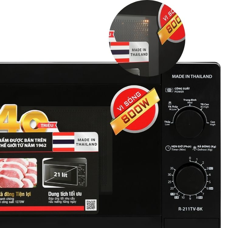 Lò vi sóng Sharp R-211TV-BK 21 lít được sản xuất tại Thái Lan, dung tích 21 lít, màu đen sang trọng, hiện đại, dễ sử dụng với bảng điều khiển nút vặn, là thiết bị hỗ trợ bạn hâm nóng, chế biến thức ăn nhanh chóng, tiện lợi. Xuất xứ Sản phẩm đến từ thương hiệu uy tín Sharp - Nhật Bản, được sản xuất tại Thái Lan, đảm bảo chất lượng. Công suất - Dung tích - Chức năng chính - Lò vi sóng Sharp này có công suất vi sóng 800W, cho khả năng làm nóng nhanh, tiết kiệm thời gian chờ đợi. - Dung tích 21 lít có thể bỏ vừa gà nguyên con khoảng 1 kg.
