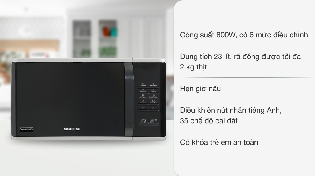- Loại lò: Lò vi sóng không nướng - Dung tích: 23 lít - Công suất vi sóng: 800W - Chất liệu khoang lò: Tráng men Ceramic - Thương hiệu của: Hàn Quốc - Sản