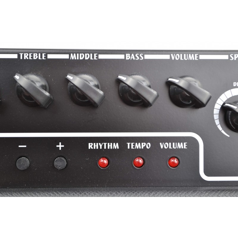 - (2) Reverb Máy đánh trống tích hợp với hơn 30 nhịp cài đặt sẵn: JOYO DC-30 có máy đánh trống chứa 36 nhịp và nhịp đặt trước. Phần nhịp điệu cũng bao gồm một điều khiển âm lượng dễ dàng truy cập cho các bộ phận trống của bạn, làm cho DC-30 trở thành một bộ khuếch đại thú vị, dễ sử dụng với các tính năng bổ sung tuyệt vời. Bộ điều khiển ba chức năng trên DC-30: cho phép thay đổi nhịp độ và nhịp điệu nhanh chóng. Nút "TURN" chuyển đổi giữa ba chức năng; nhịp điệu, nhịp độ và âm lượng. Sau khi chọn chức năng bằng TURN, hãy kiểm soát mức độ / tốc độ của bạn hoặc chọn kiểu trống của bạn bằng cách sử dụng các nút "+" và "-". "ACTIVE" bật và tắt máy trống, nhưng sẽ bắt đầu từ kiểu trống đã sử dụng gần đây nhất của bạn sau khi được bật lại. Tắt toàn bộ amp không lưu mẫu trống nào bạn đã chọn. Chơi cùng với Âm nhạc của riêng bạn: Đi kèm với DC-30 là một đầu vào phụ, nằm ở mặt sau của amp. Thông qua đó, bạn có thể kết nối máy nghe nhạc MP3, iPod, máy tính xách tay hoặc điện thoại và chơi theo giai điệu của nghệ sĩ yêu thích của bạn. Đầu vào tai nghe loại bỏ loa ngoài và hoàn hảo khi luyện tập yên tĩnh là bắt buộc. Thông số kỹ thuật Ampli Guitar Electric Joyo DC30