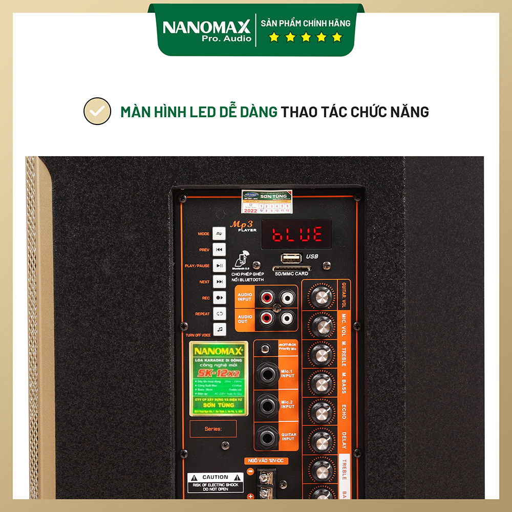 Loa kéo Nanomax SK-12F3 có Bass 30 cm (3 tấc) với công suất lớn 450 watt phù hợp hát karaoke gia đình hoặc ngoài trời với kết nối bluetooth phạm vi không gian siêu rộng, thời lượng pin lâu bền bỉ với loa 2 đường tiếng cho âm thanh hay sống động. THÔNG SỐ KỸ THUẬT LOA KÉO NANOMAX SK-12F3: • Loại: Karaoke di động • Mã: SK-12F3 • Số lượng kênh: 2 đường tiếng • Công suất: 450W • Thời gian sạc: 3-4 tiếng • Thời gian pin: 5-8 tiếng tùy âm lượng • Tiện ích: Cổng USB, thẻ nhớ • Kết nối không dây: Bluetooth 5.0 xa 15m, Mic UHF • Kết nối khác: Jack RCA Audio IN/OUT kết nối Micro có dây và Đàn Guitar bên ngoài • Kích thước/ Trọng lượng: (42 x 41 x 72)cm / 23.5kg • Trọng lượng đóng gói: (49x47x78)cm / 26kg • Chất liệu thùng: Gỗ sơn gai chống trầy • Sản xuất tại: Việt Nam • Bảo hành loa bass, treble và bo mạch chính: 12 tháng • Số lượng loa: 1 loa bass 3 tấc + 1 loa treble họng còi • Sử dụng nguồn: AC 220V hoặc Ắc qui 12V • Phụ kiện: 1 dây sạc, 2 micro và 4 pin ️ CHẾ ĐỘ BẢO HÀNH ️ 1 đổi 1 trong 7 ngày nếu lỗi nhà cung cấp Thời gian bảo hành: 12 tháng ️GIỜ LÀM VIỆC CỦA SHOP ️ Tất cả các ngày trong tuần từ 7h30 đến 5h ( Nghỉ Chủ Nhật và Các Ngày Lễ ). ️ Follow shop để được áp mã giảm giá cho khách hàng thân thiết. ️ CAM KẾT CỦA SHOP ️ • Cung cấp những sản phẩm chính hãng với chất lượng phù hợp với giá tiền • Sản phẩm luôn được test kỹ trước khi đóng gói và vận chuyển • Hỗ trợ tư vấn / Hướng dẫn sử dụng 24/7 thông qua Chat • Thời gian đổi trả theo đúng quy định