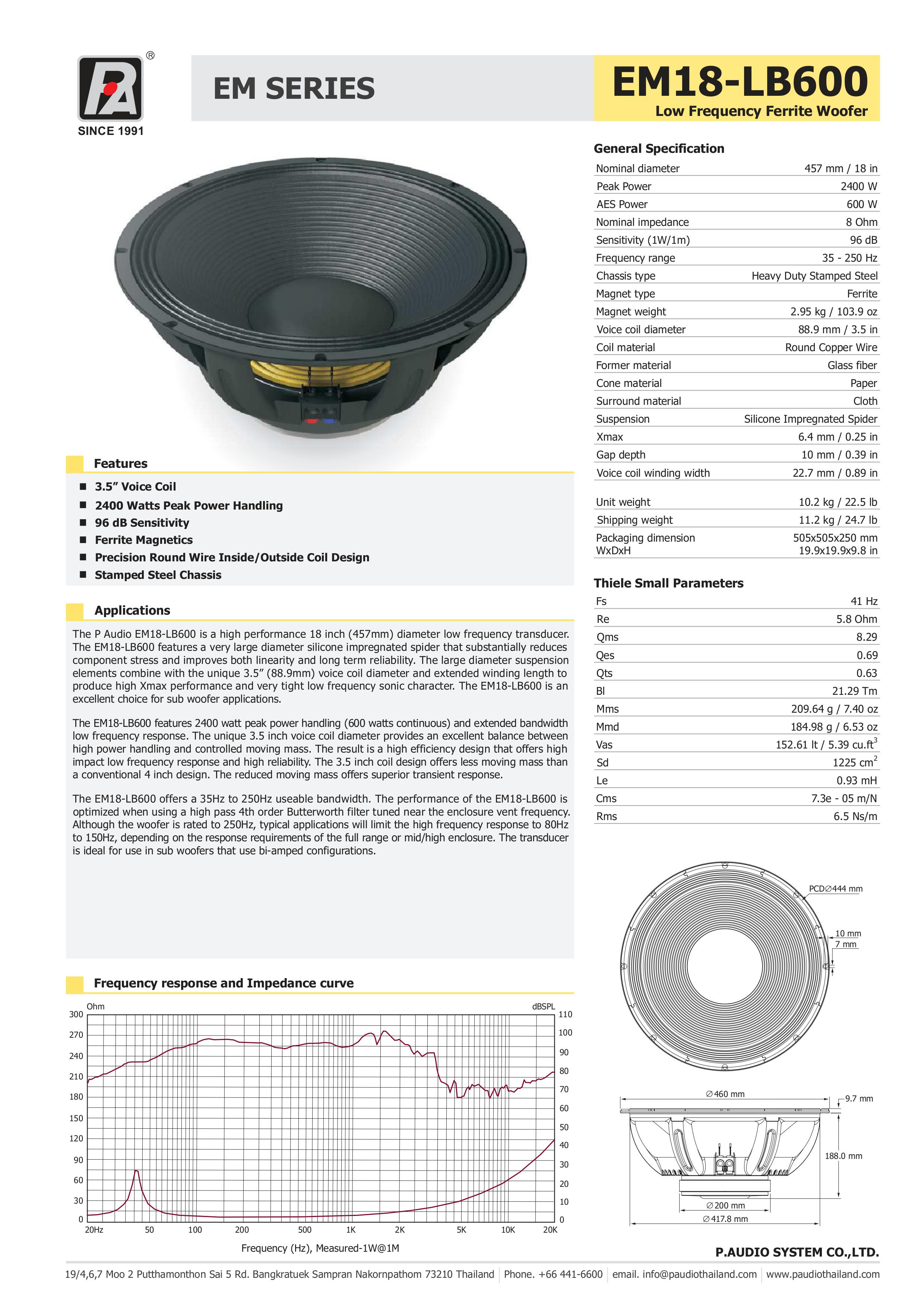 Mua tại TiktokLoa 5 tấc từ sắt Thương hiệu: PAUDIO Xuất xứ: Thái Lan Công suất: 600W Công suất đỉnh: 2400w Thích hợp làm Sub cho gia đình hay sân khấu nhỏ Voice coil khổ lớn 3.5” - 88.9mm Mạng nhện đơn tẩm keo Silicon Voice coil dây đồng cuốn trong-ngoài (inside/outside) giúp cải thiện hiệu suất chuyển đổi và giải nhiệt tốt. Khung loa được đúc bằng sắt cứng. Khối lượng loa: 10.2 kg Đóng gói: 11,2 kg