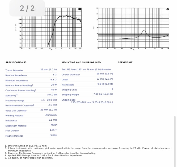 Xuất xứ: Ý Độ nhạy trung bình 99 dB SPL 1W / 1m. 65 mm (2.5 in) Interleaved Sandwich Voice coil (ISV). Công suất 350W. Công suất liên tục 500W. Nam châm neodymium bên ngoài.
