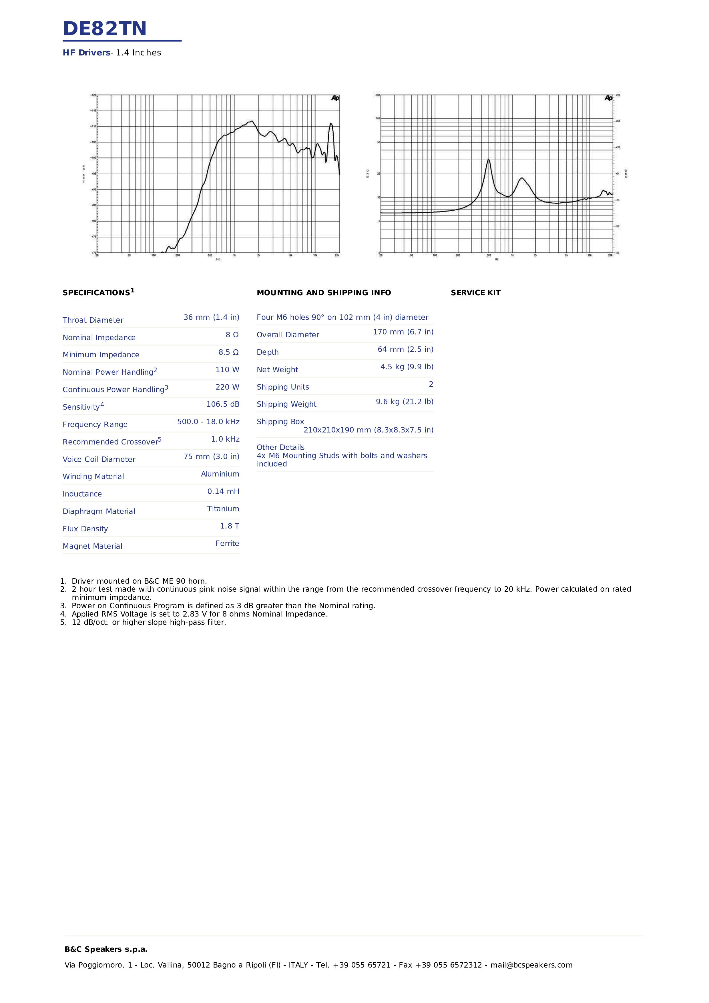 Loa Treble B&C SPEAKERS DE82TN Xuất xứ: Italia Sử dụng họng 1.4" (ME 90) Voice coil aluminium 75mm (3") Công Suất Program 220 W Dải tần: 500 - 18000hz Độ nhạy: 106,5