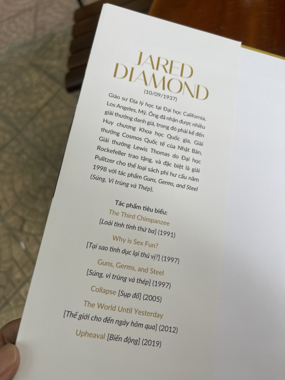 Chúng ta đã quen với Jared Diamond. Học giả hiểu biết thâm sâu về lịch sử - văn hoá - địa chính trị. Các phát kiến ông đưa ra luôn khiến ta phải suy ngẫm.