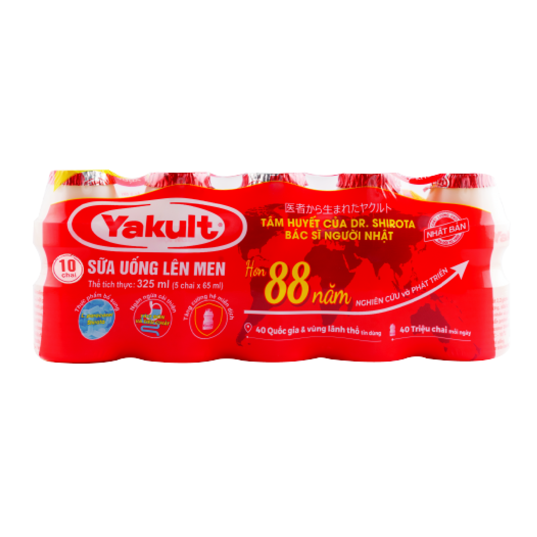 Với sản phẩm tươi sống, trọng lượng thực tế có thể chênh lệch khoảng 10%. Mỗi ngày 1 chai Yakult, vì sức khỏe của bạn. Bổ sung lợi khuẩn Lacticaseibacillus paracasei Shirota tiến đến đường
