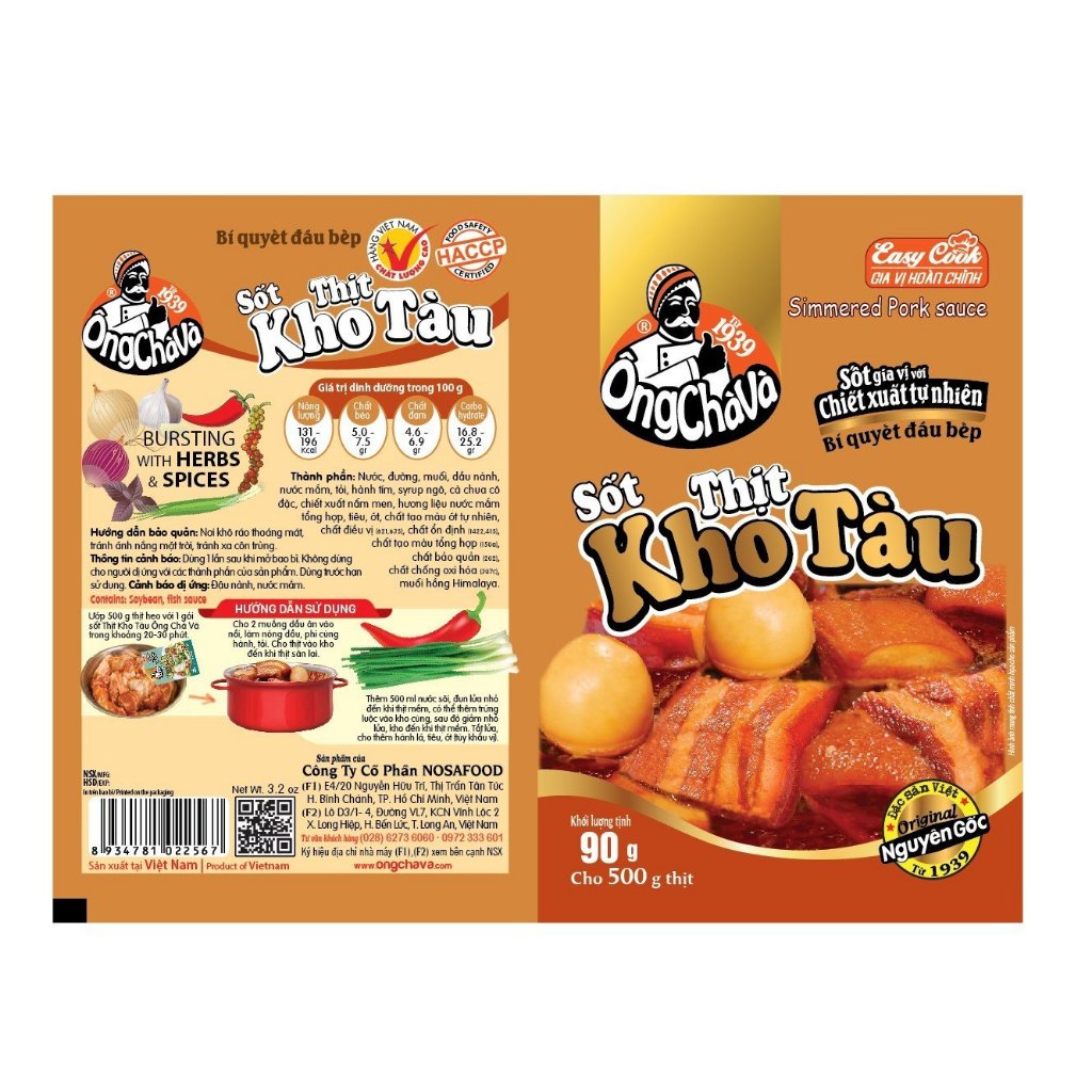 Sốt Bò Kho Sốt Vang Ông Chà Và 90g là loại gia vị nêm sẵn được sản xuất trên quy trình công nghệ hiện đại, nguồn nguyên liệu chất lượng, đảm bảo an toàn cho người sử dụng. 1. THÔNG TIN SẢN PHẨM - Thương hiệu: Ông Chà Và. - Trọng lượng: 90gr. - Số lượng: 15 gói - Thành phần: Nước, dầu nành, muối ăn, đường cát, sả, lá cà ri, bột quế, bột đại hồi, đinh hương, ớt, gừng, hành tím, cà chua, tỏi,... - HSD: 12 tháng kể từ ngày sản xuất. - Nhà sản xuất: Công ty cổ phần Nosafood. - Địa chỉ sản xuất: Lô D3/1-4 Đường VL7, KCN Vĩnh Lộc 2, xã Long Hiệp, huyện Bến Lức, tỉnh Long An. 2. MỘT SỐ MÓN ĂN GỢI Ý Dùng để chế biến món Bò Kho Sốt Vang đơn giản tại nhà. - Hướng dẫn sử dụng: + Bước 1: Ướp 1 gói gia vị Sốt bò kho sốt vang Ông Chà Và 90g với 400g thịt bò đã làm sạch trong 15 phút. + Bước 2: Phi thơm hành, tỏi băm rồi cho thịt bò đã ướp vào chảo đảo đều đến khi thịt săn lại. Thêm nước ngập thịt đun sôi, để lửa nhỏ và đậy vung trong 90 phút đến khi thịt chín mềm. + Bước 3: Thêm khoai tây, cà rốt, hành tây thái vừa miếng đun them 10-15 phút. Hòa tan bột năng với nước rồi cho vào nồi thịt nấu sôi. + Bước 4: Múc ra bát và thưởng thức cùng bánh mì, cơm, bún/phở. 3. HƯỚNG DẪN BẢO QUẢN - Để nơi thoáng mát, tránh tiếp xúc ánh nắng mặt trời. - Sau khi mở bao bì, gói kín, bảo quản trong ngăn mát tủ lạnh. 4. CAM KẾT TỪ SHOP - Sản phẩm đạt tiêu chuẩn ISO 22000, HACCP và đảm bảo An toàn vệ sinh thực phẩm. - Cam kết hàng rõ nguồn gốc, xuất xứ, đền tiền gấp đối nếu phát hiện hàng giả, hàng không đúng thương hiệu, quá hạn sử dụng khi khách hàng nhận đơn hàng. - Nếu giao sai/thiếu sản phẩm, Shop chịu trách nhiệm 100%. Trừ trường hợp sản phẩm bị móp méo về ngoại quan vì đây là do vấn đề khách quan từ nhiều yếu tố như vận chuyển, bảo quản hàng hóa từ kho. #ongchava #giavi #giavipho #giaviphobo #viengiavi #sotuopthitnuong #sate
