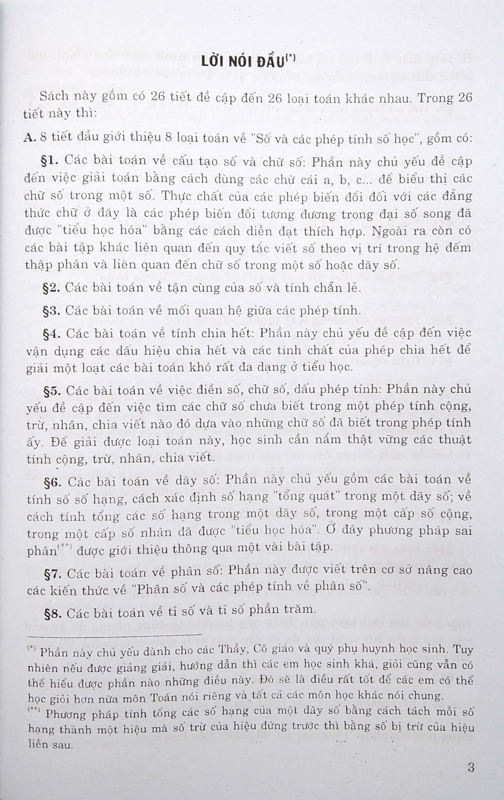 Sách này gồm 26 tiết đề cập đến 26 loại toán khác nhau. Đối với mỗi bài toán, bạn nên đọc thật kĩ đề, tìm hiểu cặn kẽ những đặc điểm của bài toán rồi tự mình suy nghĩ, cố hắng tìm ra lời giải, cố gắng tìm được nhiều cách giải và lựa chọn trong đó cách giải nào hay nhất. Sau đó mới tìm xem lời giải của bài toán mà sách đã nêu. Đa số các bài toán ở sách này đều là toán khó, trong đó có nhiều bài được rút ra từ các kì thi học sinh giỏi toán bậc tiểu học toàn quốc và các tỉnh, thành phố trong cả nước.