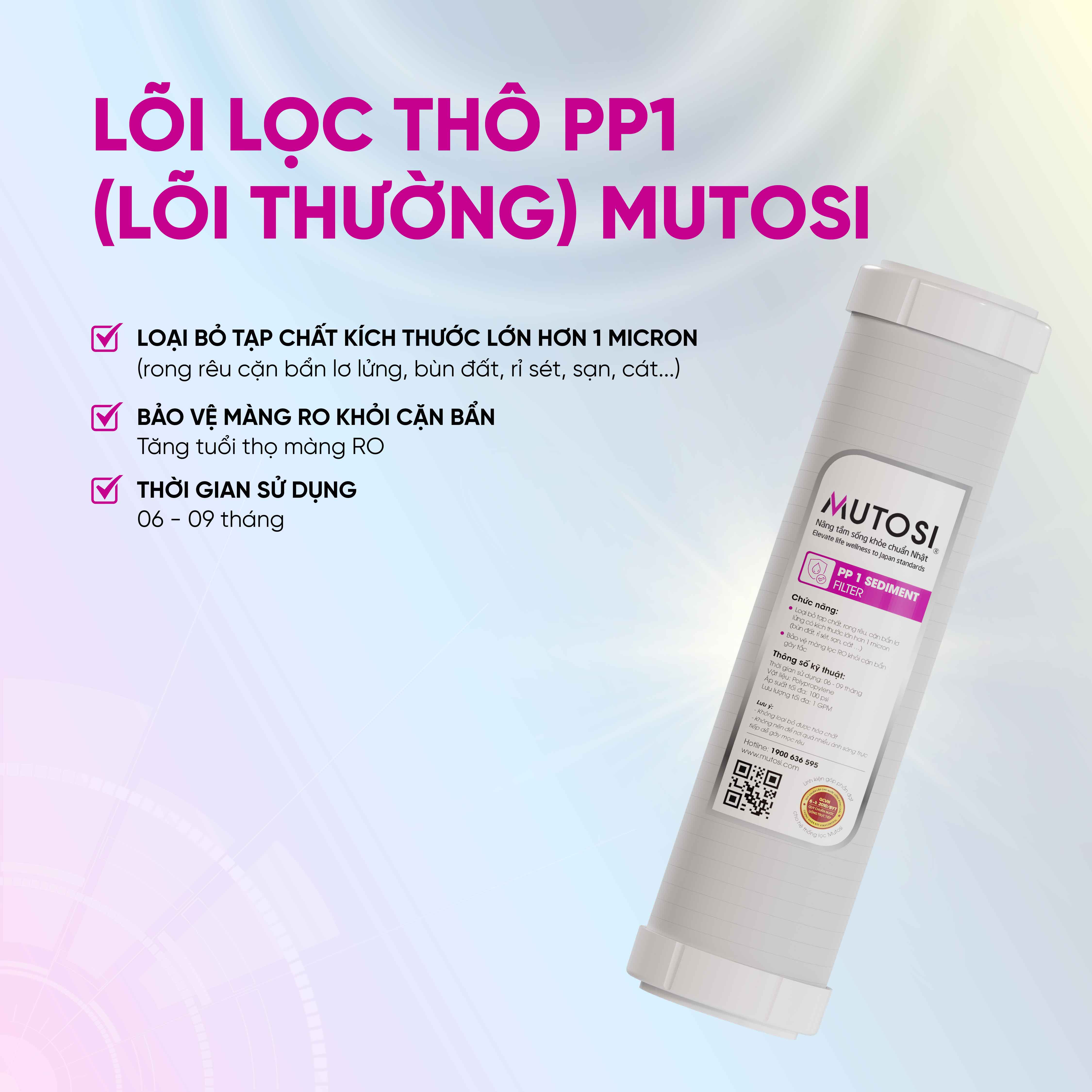 - Giới thiệu chung về lõi số 3 – PP 1 micron Lõi số 3 - PP 1 micron là một loại lõi lọc nước được sử dụng phổ biến trong các sản phẩm máy lọc nước hiện nay. Công dụng chủ yếu của PP 1 micron là lọc các tạp chất siêu nhỏ, có khả. Lõi số 3 - PP 1 micron hiện đang được phân phối bởi thương hiệu Mutosi. Với phương châm “Nâng tầm sống khỏe chuẩn Nhật”, Mutosi luôn nỗ lực trong việc mang đến sản phẩm đa dạng, chất lượng và tốt cho sức khỏe người dùng. Trong đó, lõi số 3 - PP 1 micron luôn được đảm bảo chất lượng tối ưu, bền, tuổi thọ cao. Với công nghệ hiện đại, quá trình sản xuất tiên tiến và nghiêm ngặt, lõi số 3 - PP 1 micron đảm bảo hiệu quả lọc tối ưu, tuổi thọ cao.