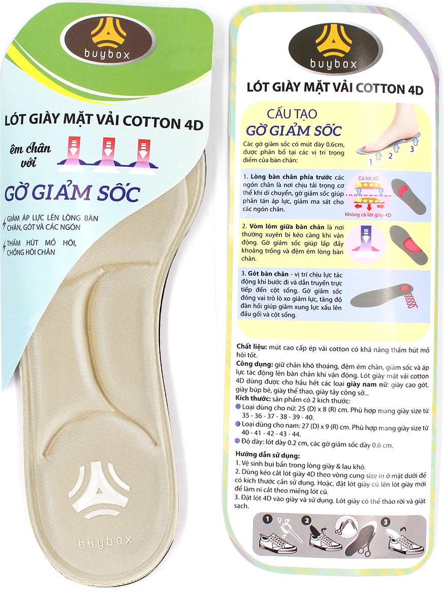 - Đặt lót đa năng vào giày để sử dụng Lưu ý: Sản phẩm mang thương hiệu buybox có bao bì in logo và hướng dẫn sử dụng chi tiết đi kèm.