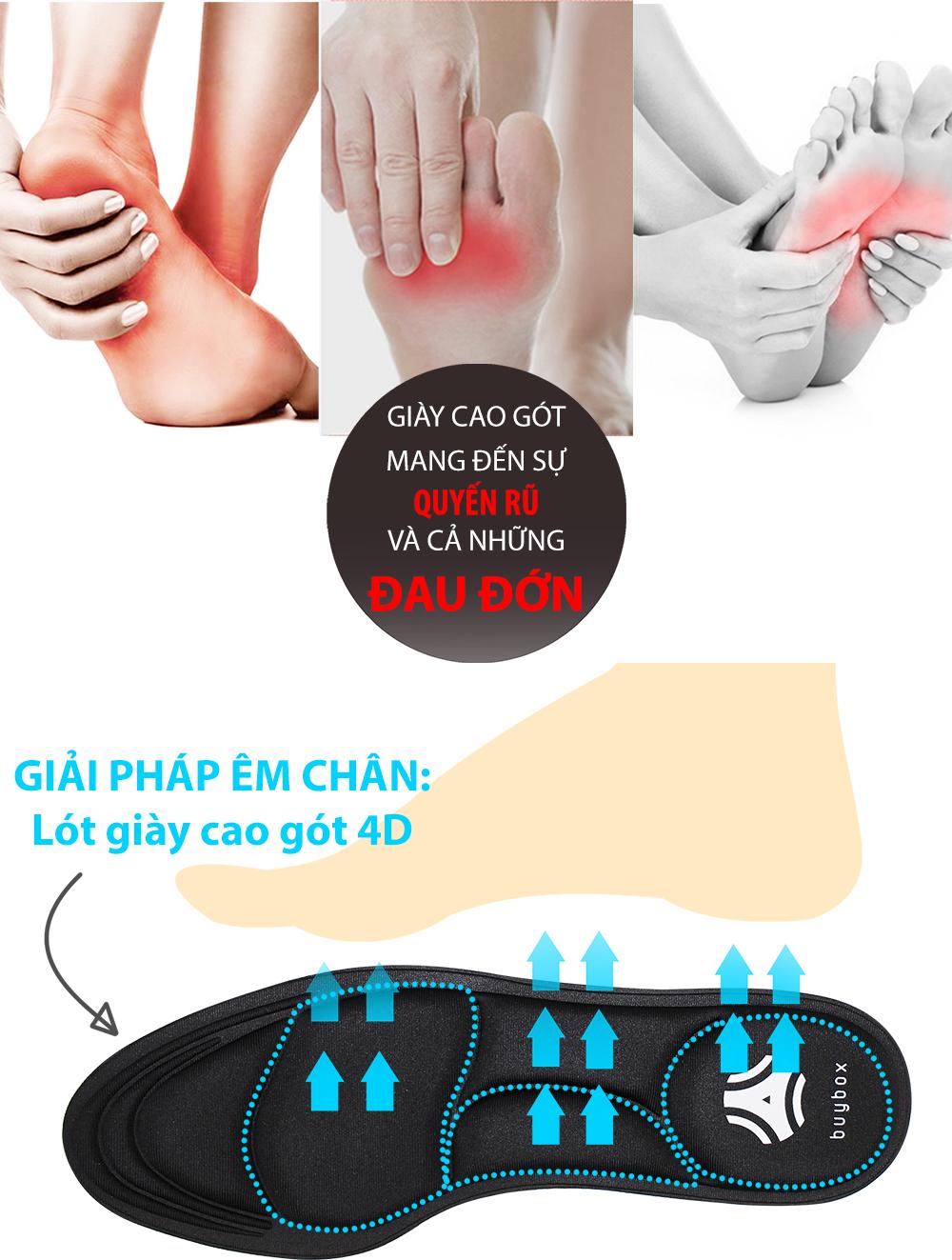 - Từ nay không còn phải lo lắng nữa vì đã có lót giày đa năng 4D buybox giúp êm chân & chống hôi chân. CÔNG DỤNG NỔI BẬT Loại lót giày nguyên bàn chân, thiết kế 4D cực êm Sản phẩm có thể giặt sạch bằng xà phòng nhẹ và tái sử dụng nhiều lần, dễ tháo lấp Giày đi lâu ngày, phần lót giày bị lún, lót vào đi êm chân hơn, thoải mái. Sản phẩm thiết kế 4D, kết hợp 2 trong 1 vừa bảo vệ chân, chống được mồ hôi chân. Được làm từ chất liệu cao cấp rất êm chân, thoáng khí & bền bỉ. Mặt dưới miếng lót in các đường cong tương ứng các size 35 - 36 - 37 - 38 - 39 - 40. Dùng kéo cắt theo các đường cong này để có được kích thước cần sử dụng. Lót giày đa năng 4D sử dụng được cho nhiều loại giày khác nhau như: giày cao gót mũi nhọn, giày búp bê mũi nhọn, giày mọi, giày lười, giày thể NGỮ CẢNH SỬ DỤNG