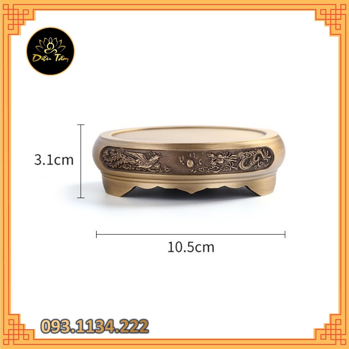 Tên sản phẩm: Đôn, chân đế lư hương rồng phượng Chế tác: Thủ công Chất liệu: Đồng nguyên chất đúc nguyên khối Màu sắc: Đồng Kích thước: 10,5cm x3,1 cm Công dụng: để lư hương,