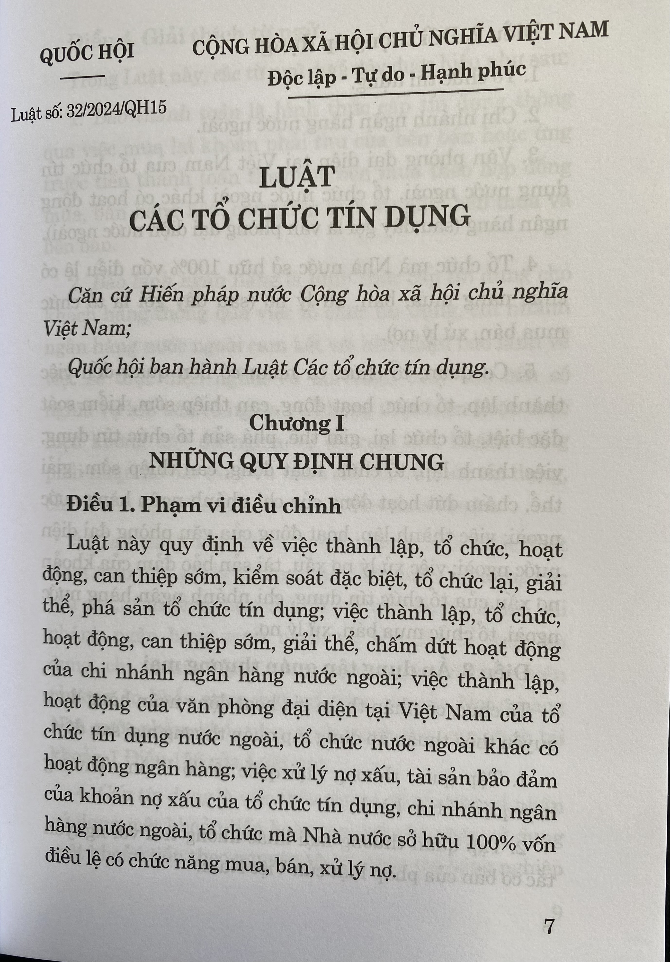 Luật Các Tổ Chức Tín Dụng 32/2024/QH15 ( Luật có hiệu lực thi hành từ ngày 01-07-2024 ) Luật này quy định về việc thành lập, tổ chức, hoạt động, can thiệp sớm, kiểm soát đặc biệt, tổ chức lại, giải thể, phá sản tổ chức tín dụng; việc thành lập, tổ chức, hoạt động, can thiệp sớm, giải thể, chấm dứt hoạt động của chi nhánh ngân hàng nước ngoài; việc thành lập, hoạt động của văn phòng đại diện tại Việt Nam của tổ chức tín dụng nước ngoài, tổ chức nước ngoài khác có hoạt động ngân hàng; việc xử lý nợ xấu, tài sản bảo đảm của khoản nợ xấu của tổ chức tín dụng, chi nhánh ngân hàng nước ngoài, tổ chức mà Nhà nước sở hữu 100% vốn điều lệ có chức năng mua, bán, xử lý nợ.
