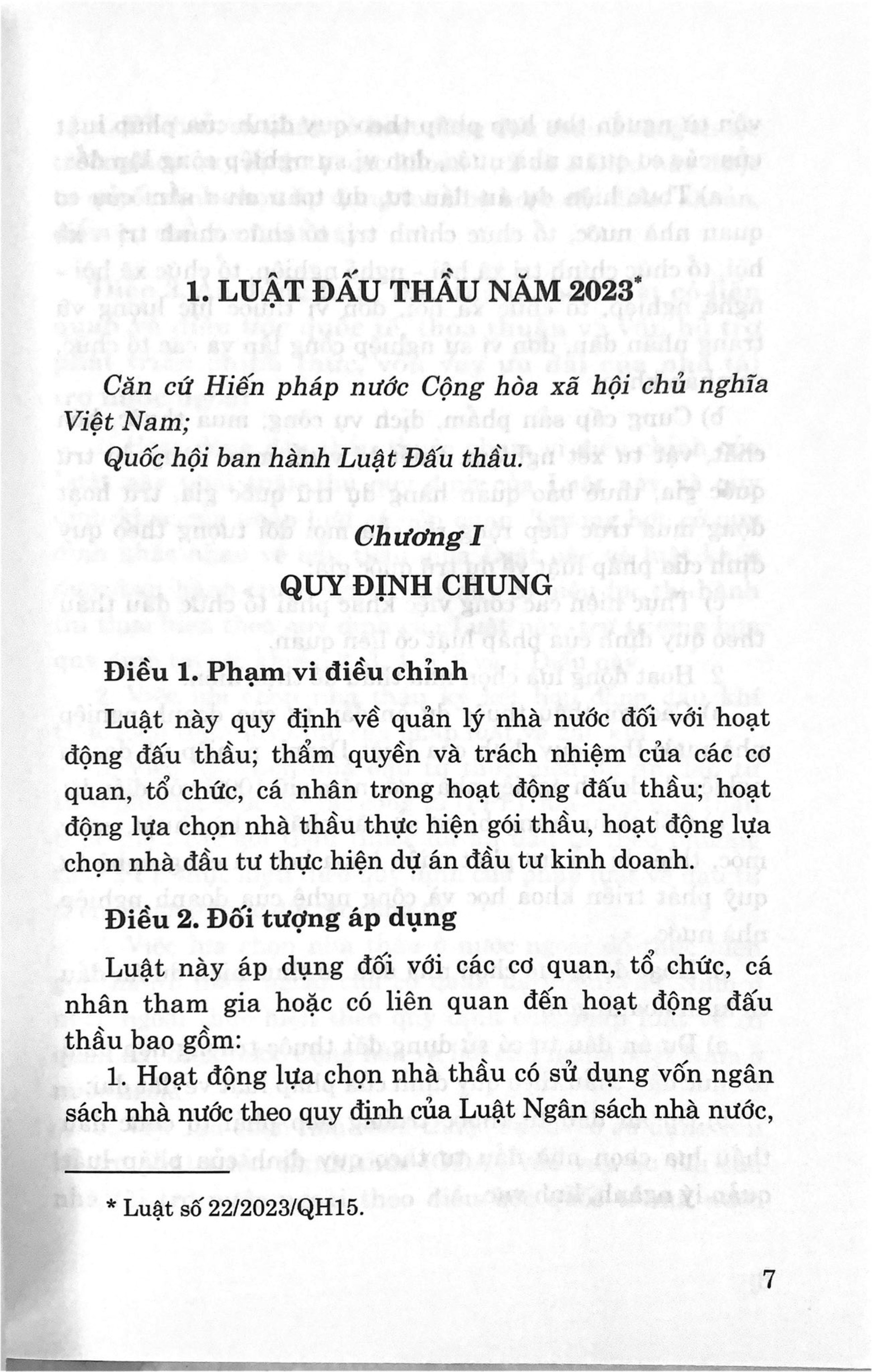 Luật Đấu thầu năm 2023 được Quốc hội khóa XV, kỳ họp thứ 5 thông qua ngày 23/6/2023, có hiệu lực thi hành từ ngày 01/01/2024, thay thế Luật Đấu thầu năm 2013 (sửa đổi, bổ sung năm 2016, 2017, 2019, 2020, 2022). Luật này quy định về quản lý nhà nước đối với hoạt động đấu thầu; thẩm quyền và trách nhiệm của các cơ quan, tổ chức, cá nhân trong hoạt động đấu thầu; hoạt động lựa chọn nhà thầu thực hiện gói thầu, hoạt động lựa chọn nhà đầu tư thực hiện dự án đầu tư kinh doanh.