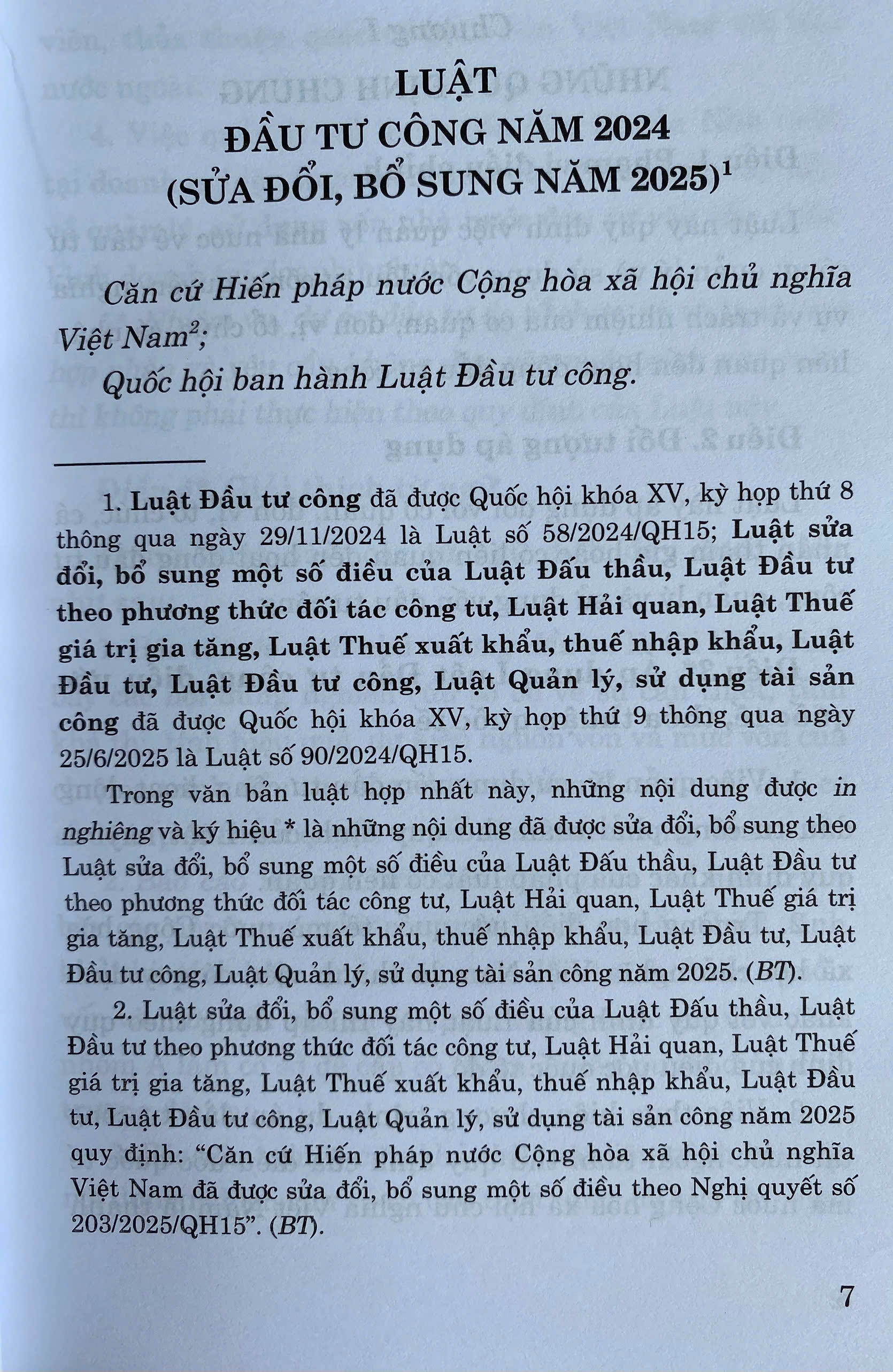 Tháng 6/2025, tại kỳ họp thứ 9, Quốc hội khóa XV đã thông qua Luật sửa đổi, bổ sung một số điều của Luật Đấu thầu, Luật Đầu tư theo phương thức đối tác công tư, Luật Hải quan, Luật Thuế giá trị gia tăng, Luật Thuế xuất khẩu, thuế nhập khẩu, Luật Đầu tư, Luật Đầu tư công, Luật Quản lý, sử dụng tài sản công có nội dung sửa đổi Luật Đầu tư công năm 2024.