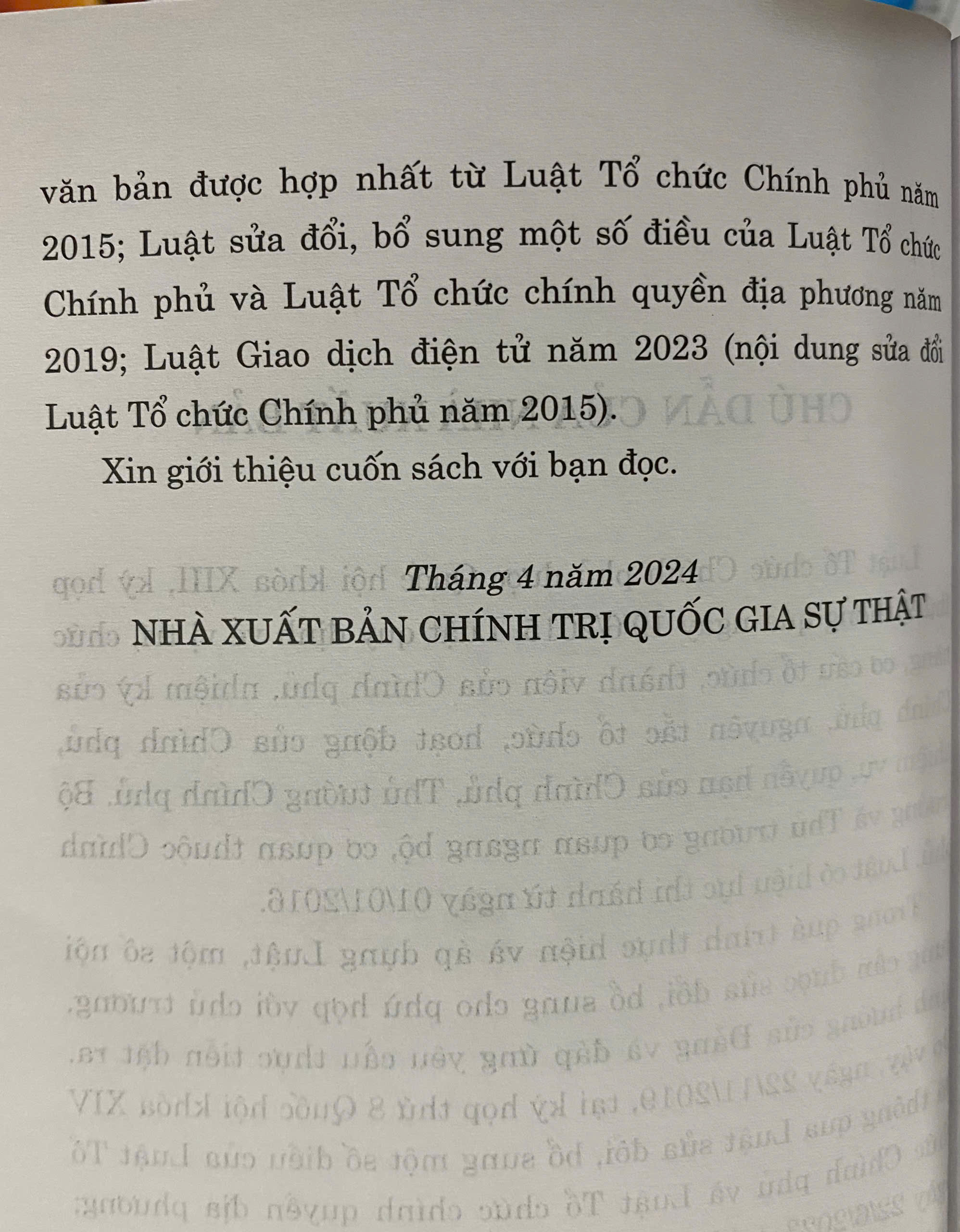 Để tạo điều kiện thuận lợi cho bạn đọc trong việc tìm hiểu và áp dụng Luật, Nhà xuất bản Chính trị quốc gia Sự thật xuất bản cuốn sách Luật Tổ chức Chính phủ năm 2015 (sửa đổi, bổ sung năm 2019, 2023). Nội dung cuốn sách là văn bản được hợp nhất từ Luật Tổ chức Chính phủ năm 2015; Luật sửa đổi, bổ sung một số điều của Luật Tổ chức Chính phủ và Luật Tổ chức chính quyền địa phương năm 2019; Luật Giao dịch điện tử năm 2023 (nội dung sửa đổi Luật Tổ chức Chính phủ năm 2015).