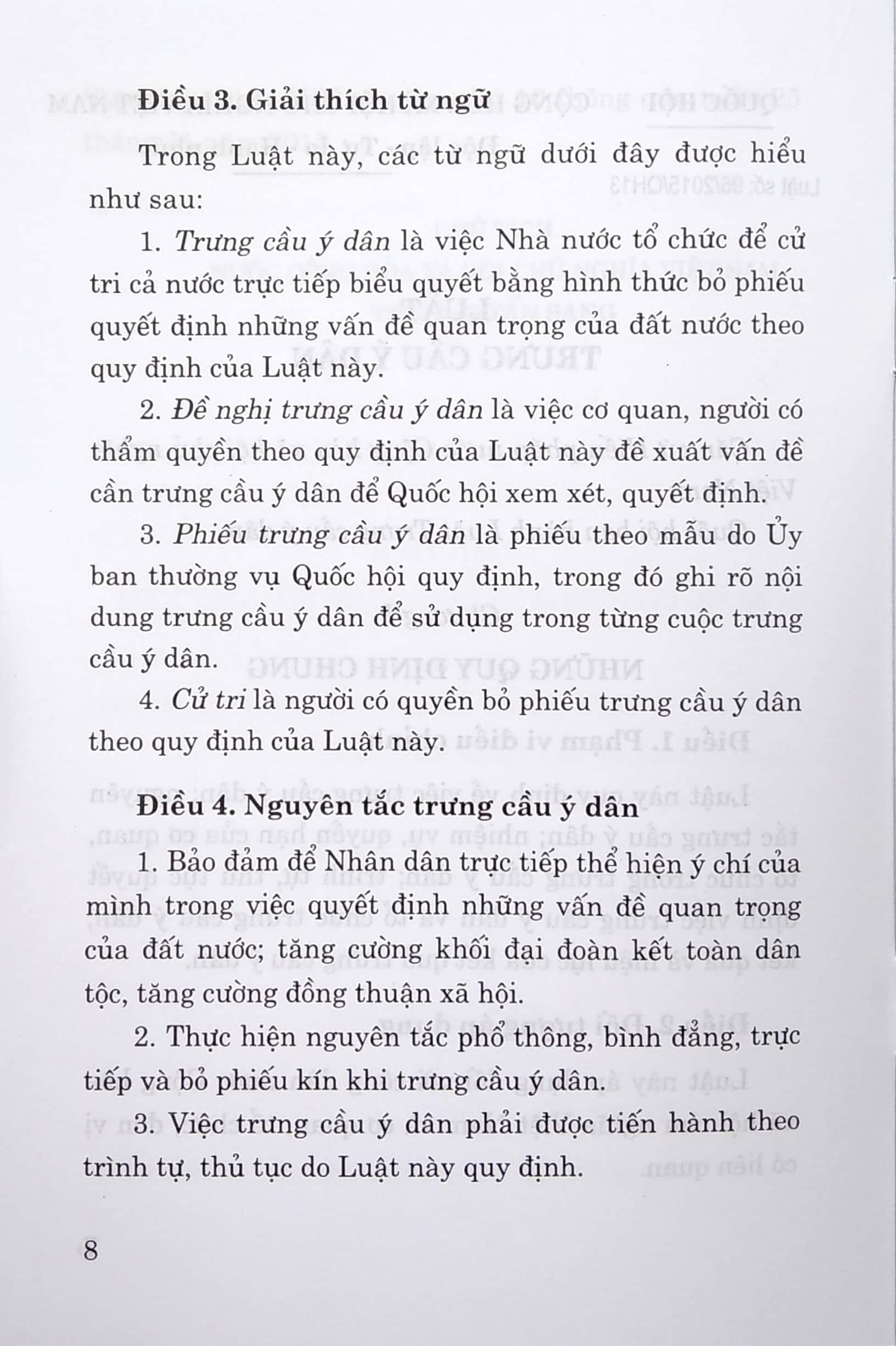 Mua tại TiktokLuật Trưng cầu ý dân (hiện hành) được Quốc hội khóa XIII, kỳ họp thứ 10 thông qua ngày 25/11/2015, có hiệu lực thi hành từ ngày 01/7/2016. Luật gồm 8 chương, 52 điều, quy định về việc trưng cầu ý dân; nguyên tắc trưng cầu ý dân; nhiệm vụ, quyền hạn của cơ quan, tổ chức trong tổ chức trưng cầu ý dân; trình tự, thủ tục quyết định việc trưng cầu ý dân và tổ chức trưng cầu ý dân; kết quả và hiệu lực của kết quả trưng cầu ý dân…