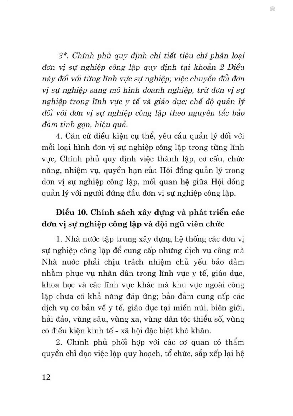 Luật Viên chức năm 2010 đã được Quốc hội nước Cộng hòa xã hội chủ nghĩa Việt Nam khóa XII, kỳ họp thứ 8 thông qua ngày 15/11/2010, có hiệu lực thi hành từ ngày 01/01/2012. Luật này quy định về viên chức; quyền, nghĩa vụ của viên chức; tuyển dụng, sử dụng và quản lý viên chức trong đơn vị sự nghiệp công lập.Cùng với những kết quả đạt được, trong quá trình thực hiện Luật đã phát sinh những bất cập cần khắc phục. Từ yêu cầu trên, ngày 25/11/2019, Quốc hội khóa XIV, kỳ họp thứ 8 đã thông qua Luật sửa đổi, bổ sung một số điều của Luật Cán bộ, công chức và Luật Viên chức. Luật này có hiệu lực thi hành từ ngày 01/7/2020.