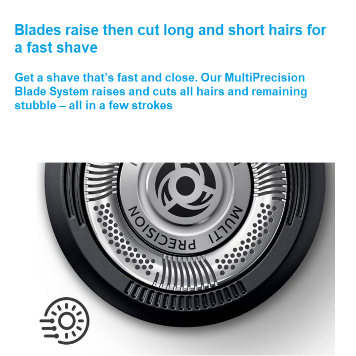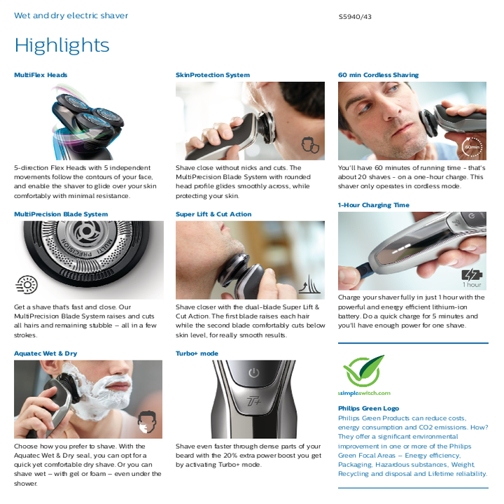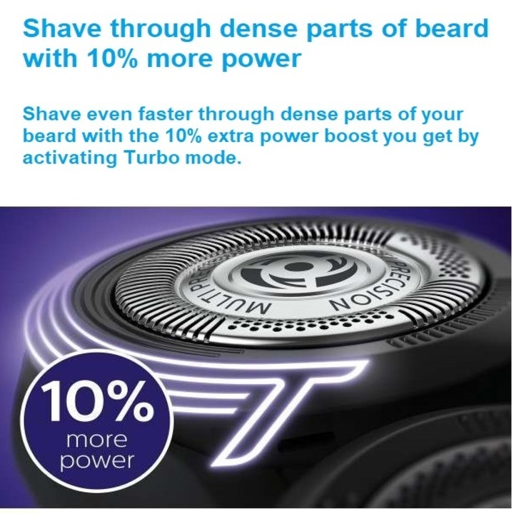 • Chọn cách cạo râu bạn thích. Với đầu bịt Khô & Ướt Aquatec, bạn có thể chọn cạo khô nhanh và thoải mái. Hoặc bạn có thể cạo ướt với kem cạo râu hay bọt cạo râu, kể cả khi tắm.  Cạo qua những phần râu rậm rạp với sức mạnh nhiều hơn 20% - Cạo nhanh hơn qua những phần râu rậm rạp với khả năng tăng thêm 20% sức mạnh khi kích hoạt chế độ Turbo. Đầu cạo linh hoạt theo 5 hướng để cạo nhanh và sát