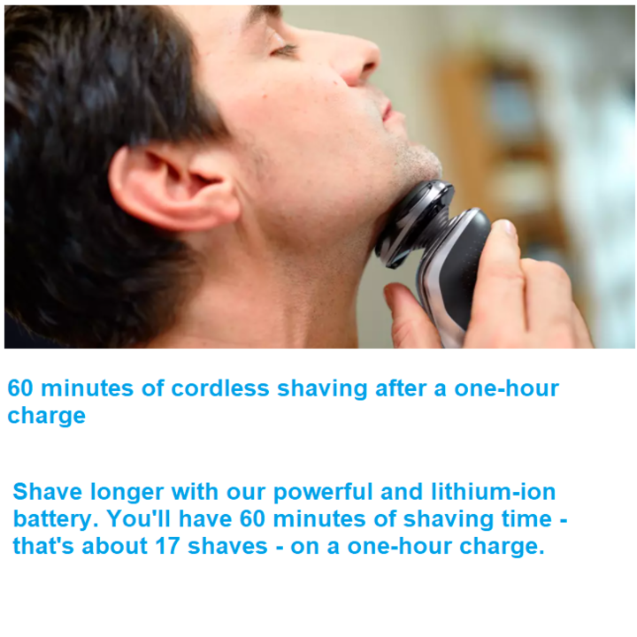 • Khi sạc pin trong 1 giờ, bạn sẽ có tối đa 60 phút để cạo râu, tương đương với 17 lần cạo. Bên cạnh đó bạn cũng có thể sạc nhanh trong 5 phút cho một lần cạo khi cần gấp. Đèn tích hợp 3 mức pin chỉ báo và đèn báo khóa