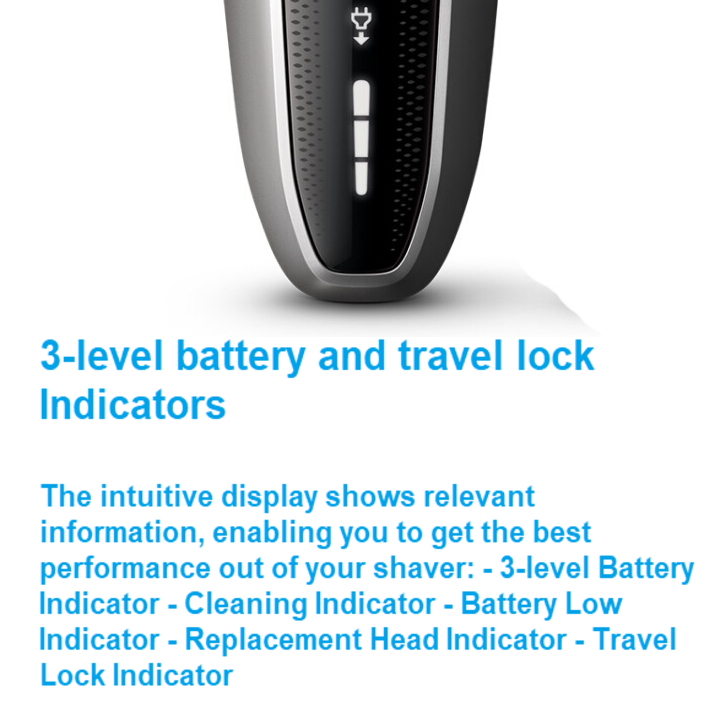 • Trên thân máy cạo râu tích hợp 3 mức đèn hiện thị rõ ràng giúp người dùng nắm được tình trạng chính xác của máy để có thể sử dụng một cách hiệu quả nhất gồm có: 3 mức pin chỉ báo và đèn báo khóa.