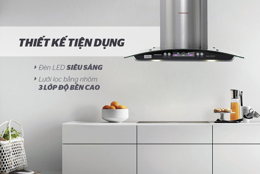 - Dễ dàng vệ sinh Kiểu dáng hiện đại với vỏ bằng inox cao cấp Sở hữu thiết kế cong khá độc đáo, Máy hút mùi kính cong Sunhouse SHB6626 còn được làm bằng thép không gỉ nổi bật. Chất liệu này không bám bẩn, không bị oxy hóa (gỉ sét) và dễ dàng vệ sinh, luôn sáng bóng như mới, tăng thẩm mỹ cho ngôi nhà. Lưới lọc bằng nhôm dày dặn & đèn LED siêu sáng Lưới lọc dày ngăn dầu mỡ, mắm muối bắn vào motor và các linh kiện khác gây hỏng hóc, giảm tuổi thọ sản phẩm. Thiết kế dễ dàng tháo rời giúp bạn tiện vệ sinh lưới lọc thường xuyên. Bên cạnh đó là 2 đèn LED có khả năng chiếu sáng tốt giúp cung cấp đủ ánh sáng cho người nội trợ nấu nướng ngon hơn. Bảng điều khiển nút nhấn cùng màn hình hiển thị rõ ràng Bảng điều khiển nằm ngay trước tầm mắt người sử dụng với hệ thống nút nhấn cùng màn hình LED hiển thị rõ ràng, dễ quan sát, dễ sử dụng. Motor siêu bền 2 tốc độ, công suất mạnh mẽ Máy hút mùi kính cong Sunhouse SHB6626 có công suất lớn tới 1100m³ /h, 2 tốc độ hút cho hiệu quả hút mùi tốt ưu lại tiết kiệm điện năng. Mùi dầu mỡ hay các mùi khó chịu khác trong quá trình nấu nướng sẽ nhanh chóng bị hút sạch, không gây ám mùi lên quần áo, các vật dụng nhà bếp hay các không gian liền kề khác (điển hình như thiết kế căn hộ chung cư). Độ ồn thấp Khi hoạt động, máy có độ ồn rất thấp (≤57dB), hầu như không làm ảnh hưởng đến các sinh hoạt khác của gia đình (trò chuyện, xem TV…) Phù hợp nhiều không gian Máy hút mùi kính cong Sunhouse SHB6626 bắt mắt, chất lượng tốt, hút mùi hiệu quả, thích hợp sử dụng trong nhà hàng, gia đình, khách sạn…