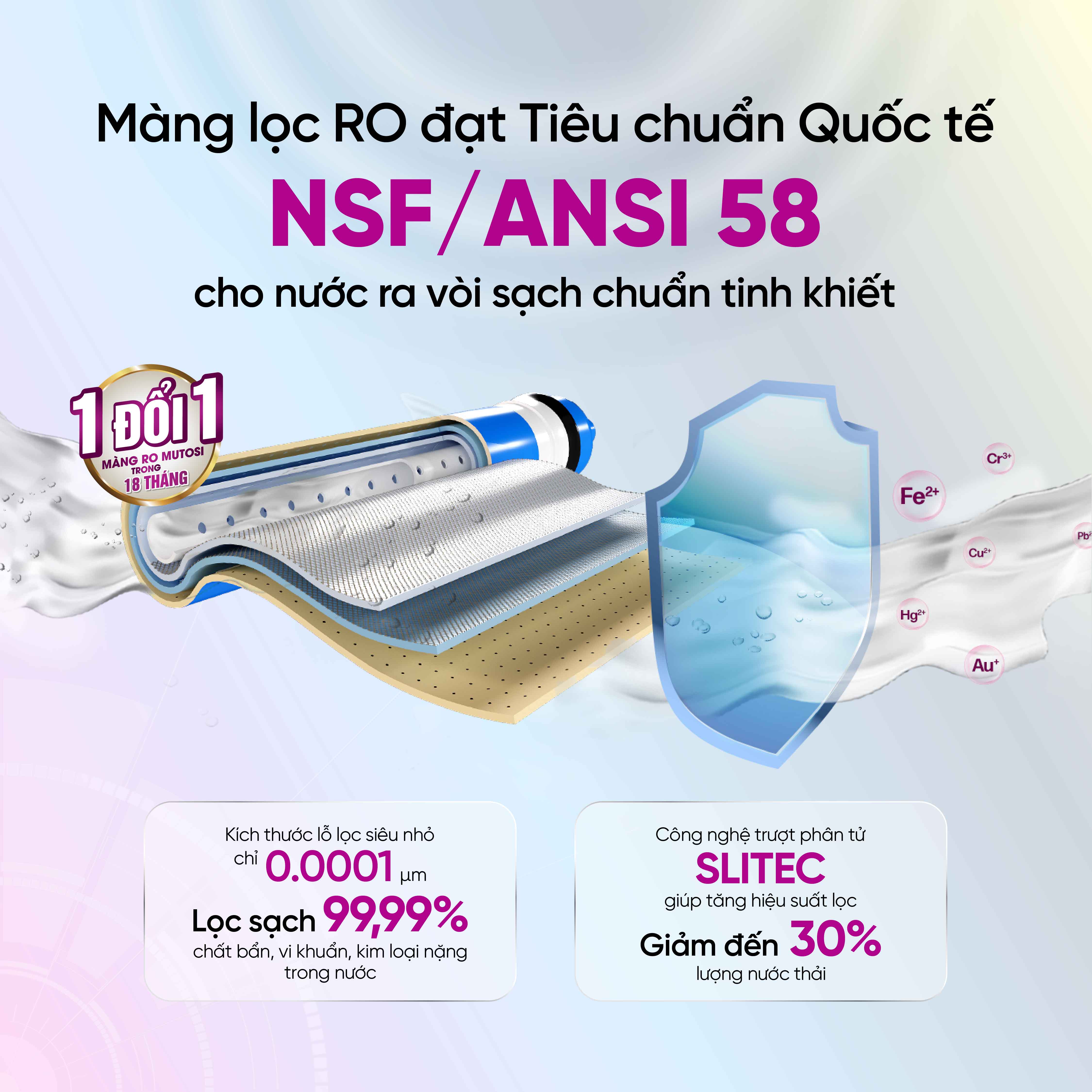 - Công nghệ SLITEC của Màng RO MUTOSI dựa trên nguyên lí trượt phân tử, lớp màng RO được cấu tạo đặc biệt với lỗ lọc siêu nhỏ cỡ nano khiến các chất gây hại có kích thước lớn bị trượt ra khỏi màng. Vì thế, chỉ những phân tử nước tinh khiết với kích thước khối lượng đủ nhỏ và có năng lượng chuyển động nhiệt đủ lớn mới thẩm thấu qua màng RO. Từ đó, màng RO Slitec Mutosi có khả năng loại bỏ tối đa các ion kim loại nặng, thuốc trừ sâu, virus, vi khuẩn, chất khí gây mùi, cho nước đầu ra hoàn toàn tinh khiết.