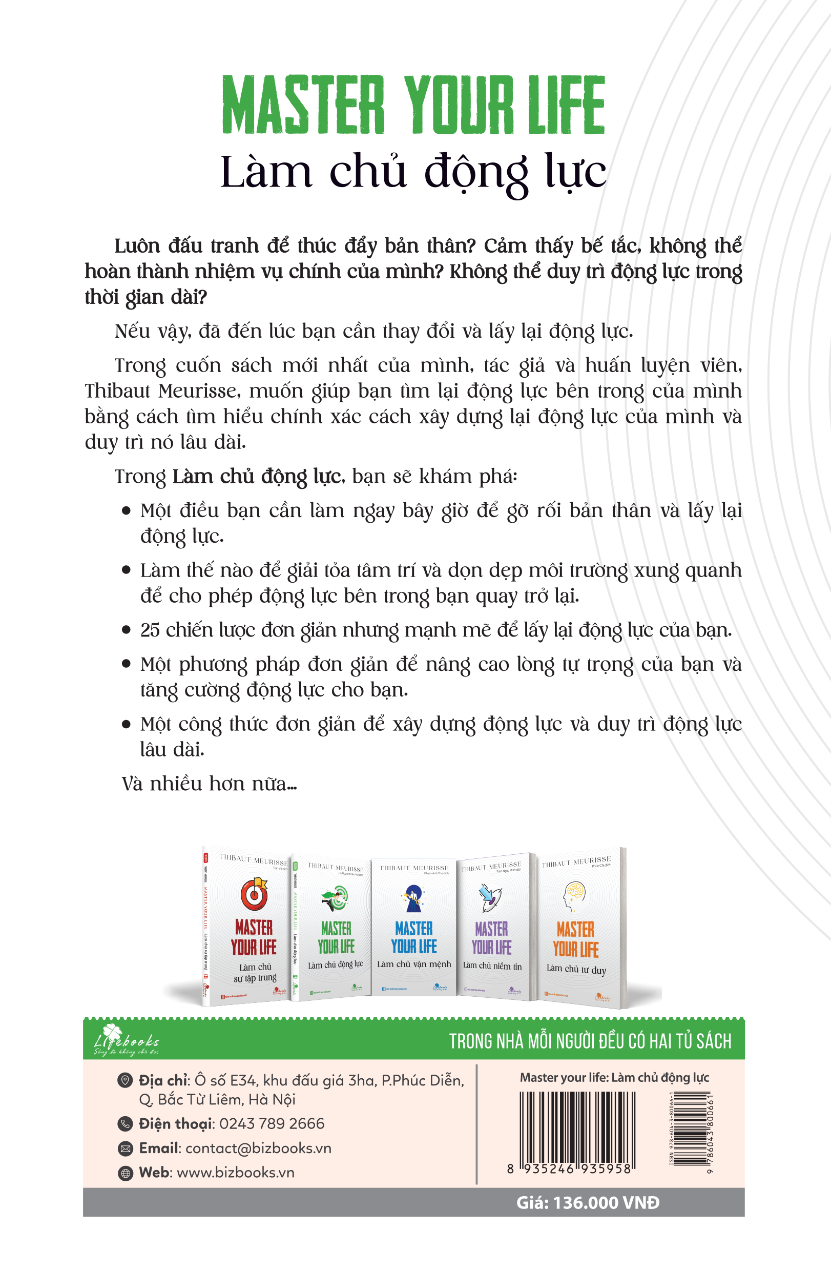 - Trong phần cuối cùng IV - 25 chiến lược đơn giản để tái tạo động lực của bạn, chúng ta sẽ xem xét 25 chiến lực bạn có thể sử dụng để tái tạo và duy trì động lực của mình. Động lực được xem như niềm hy vọng hay một sức mạnh khác giúp khởi đầu một hành động với nỗ lực tạo ra một kết quả cụ thể nào đó. Tạo động lực cho bản thân và thúc giục người khác hành động. Khi đã hiểu rõ những nguyên tắc có thể tạo động lực cho mình, bạn sẽ hiểu rõ những nguyên tắc có thể tạo động lực cho người khác. Ngược lại, một khi hiểu rõ những nguyên tắc có thể tạo động lực cho người khác, bạn cũng sẽ hiểu rõ những nguyên tắc có thể tạo động lực cho chính bản thân mình Động lực đóng một vai trò vô cùng quan trọng trong cuộc sống của chúng ta. Nó giúp ta đủ mọi việc từ bé đến lớn, từ việc dậy sớm để làm việc, cho đến vượt qua sự lười biếng để đi chạy bộ. Nó là động lực cơ bản để giúp ta hoàn thành bất kỳ một nhiệm vụ nào, ngay cả khi là một nhiệm vụ bất ngờ đột ngột xảy ra trong cuộc sống. Hy vọng bất cứ khi nào bạn cảm thấy bế tắc hay thiếu động lực, hãy sử dụng các bài tập cũng như những suy ngẫm sâu sắc trong cuốn sách Master your life - Làm chủ động lực để tái tạo động lực cho bản thân. Đã đến lúc bạn quay trở lại làm việc, hoàn thành công việc kinh doanh dang dở, làm những điều khiến bạn sợ hãi và tạo ra động lực cho bản thân. Bất cứ khi nào nghi ngờ chính mình, hãy hành động. Hành động sẽ giúp bạn vượt qua nỗi sợ hãi. Một vật thể đang chuyển động có xu hướng duy trì trạng thái chuyển động đó, và bạn cũng vậy