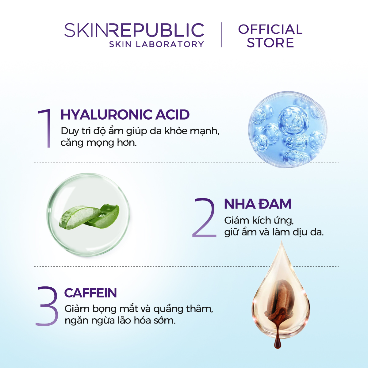 Mua tại TiktokMặt nạ mắt Skin Republic Fast Fix Holographic Foil Under Eye Patch (2 cặp) 6ml Mặt nạ mắt Skin Republic Fast Fix Holographic Foil Under Eye Patch nạp năng lượng cho đôi mắt mệt mỏi, giúp loại bỏ quầng thâm, giảm bọng mắt và làm mịn màng trong nháy mắt. Công nghệ mặt nạ thiếc sử dụng nhiệt tự thân, giúp các hoạt chất thẩm thấu sâu hơn vào da. Đồng thời lớp thiếc trên mặt nạ sẽ tạo thành hàng rào giúp dưỡng chất trong mặt nạ không bị bay hơi, được bảo toàn gần như 100% trong thời gian đắp và có tác dụng lên da tức thì, kết hợp với các thành phần chính từ Trà xanh và Axit Hyaluronic, từ đó giúp vùng da dưới mắt được nuôi dưỡng sâu hơn, vùng da quanh mắt được nhanh chóng phục hồi, làm mịn và dưỡng ẩm. Ngoài ra, cũng giúp lớp trang điểm mịn màng và lâu trôi hơn. HƯỚNG DẪN SỬ DỤNG