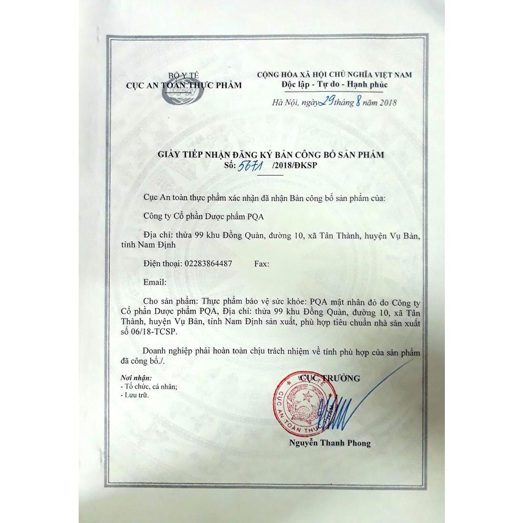 - Địa chỉ sản xuất: Công ty Cổ phần Dược phẩm PQA. Thửa 99, Khu Đồng Quàn, Xã Tân Thành, Huyện Vụ Bản, Tỉnh Nam Định. PQA MẬT NHÂN VÀNG