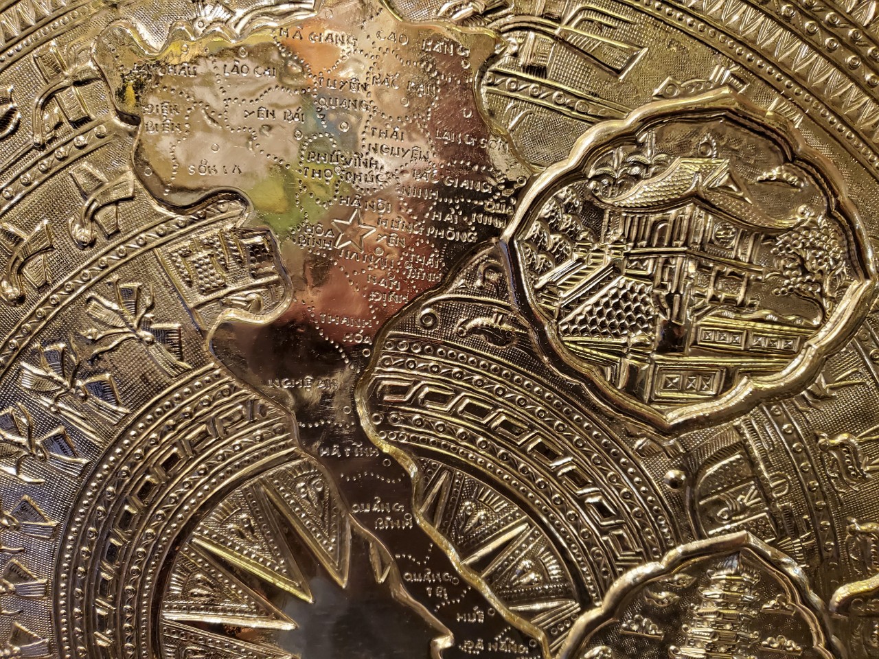 Mua tại TiktokMặt trống đồng hình bản đồ Việt Nam có họa tiết cảnh 3 miền Bắc , Trung , Nam được thúc gò nổi bằng đồng vàng nguyên chất liền khối.