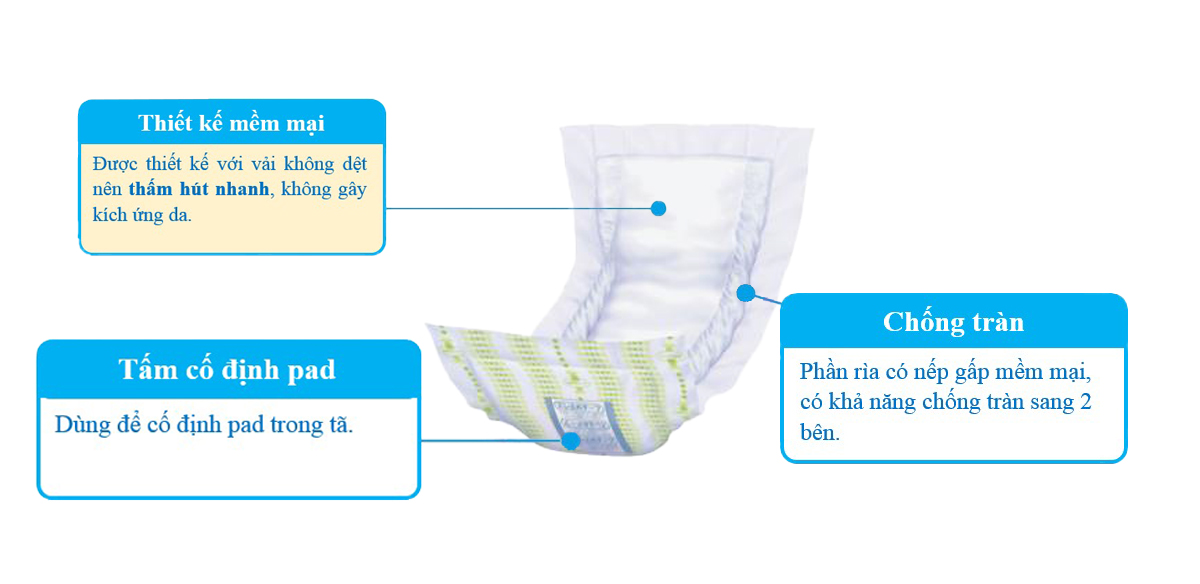 - An toàn: Phù hợp với mọi loại da: Chất liệu an toàn, không gây kích ứng da, đặc biệt phù hợp cho da nhạy cảm. Khả năng khử mùi hiệu quả: Ngăn ngừa vi khuẩn sinh sôi, giúp bạn luôn tự tin và thoải mái. Sản phẩm đạt tiêu chuẩn chất lượng: Đảm bảo an toàn cho sức khỏe người sử dụng. Thành phần: Polyethylene, Poly-urethane spandex, Hook and loop, Nonwoven fabrics, Tissue, Pulp, Sap, Hot melt glue. Thông số kỹ thuật
