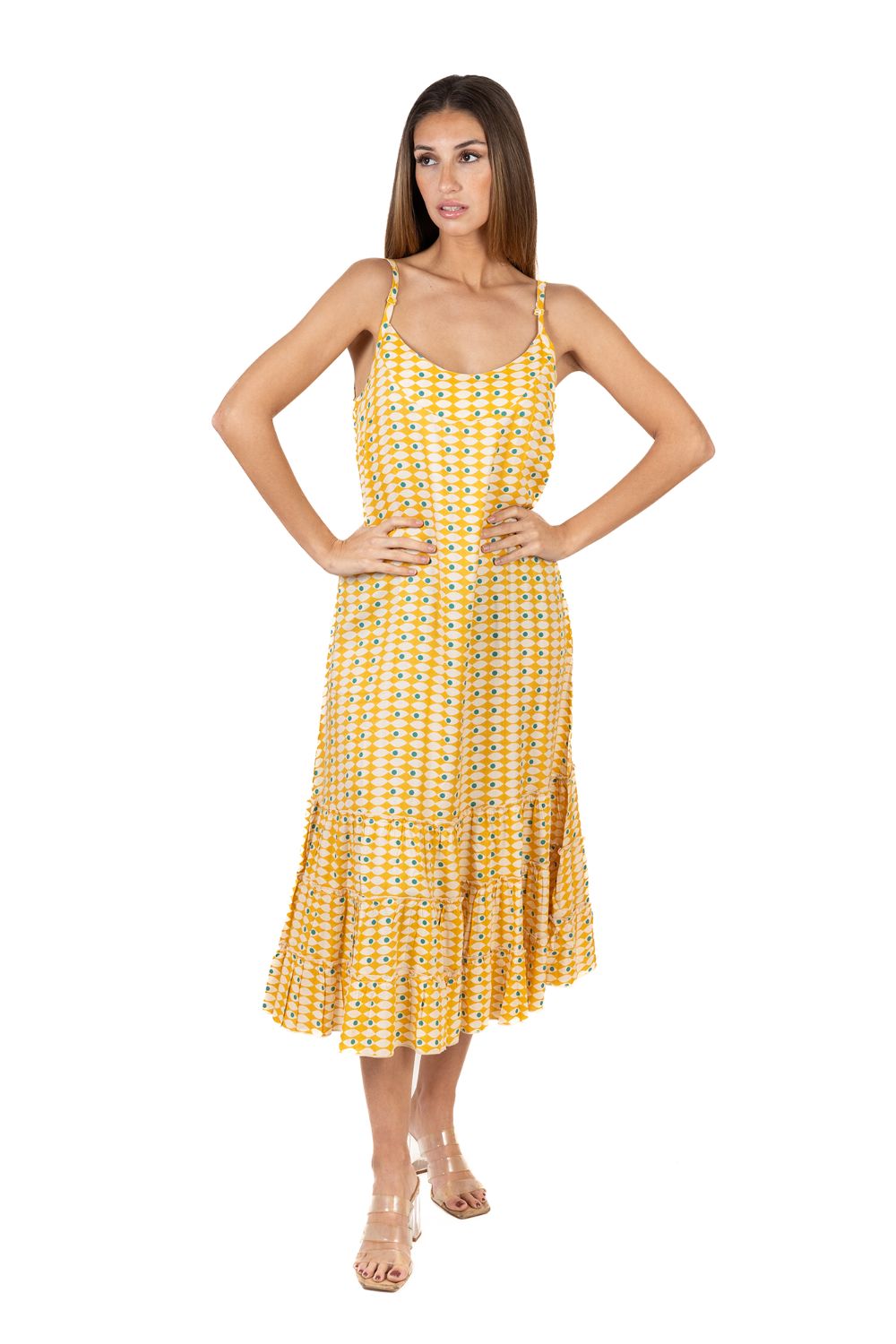 Maxi Hoa Kết Hạt Ánh Bạc Cotton Isla Bonita, chất liệu cotton mềm mại cao cấp, nổi bật phần ren phối trước ngực kết ánh bạc tinh tế, nổi bật, họa tiết hoa vàng trên