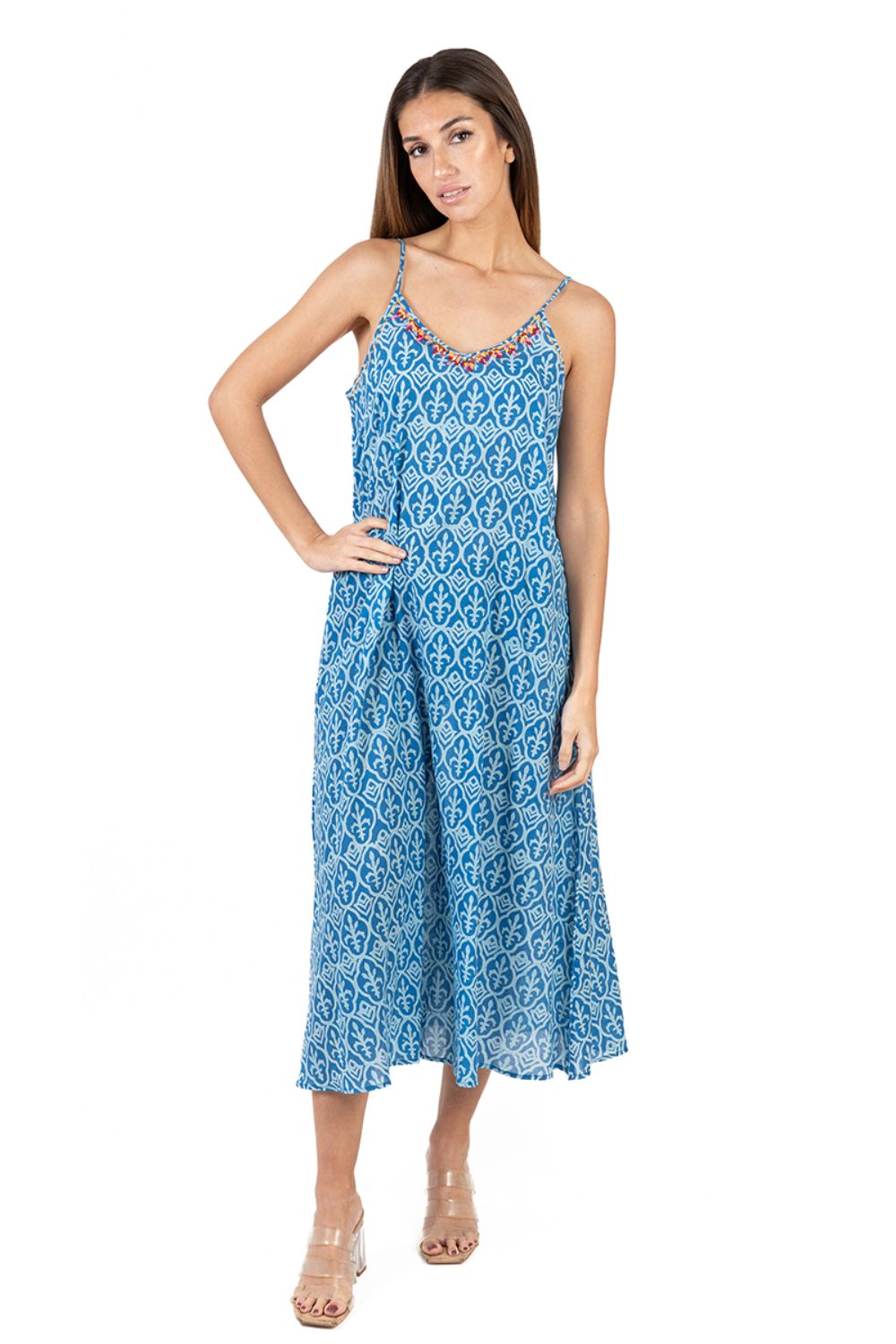 Maxi 2 Dây Thêu Cotton Isla Bonita, chất liệu cotton mềm mại, điểm xuyến thêu viền trước ngực, màu sắc trang nhã. Phom suông. Dài đầm 120cm. (40x120cm) Phù hợp đi biển, dạo phố, công