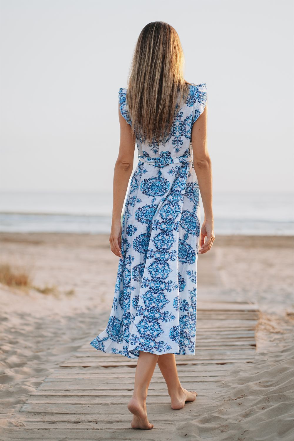 Maxi Cổ V Cotton Isla Bonita, chất liệu lụa mềm mại, cao cấp, nền vải trắng trang nhã họa tiết xanh tinh tế. Có thể mặc cổ V hoặc kéo thành trễ vai. Eo thun