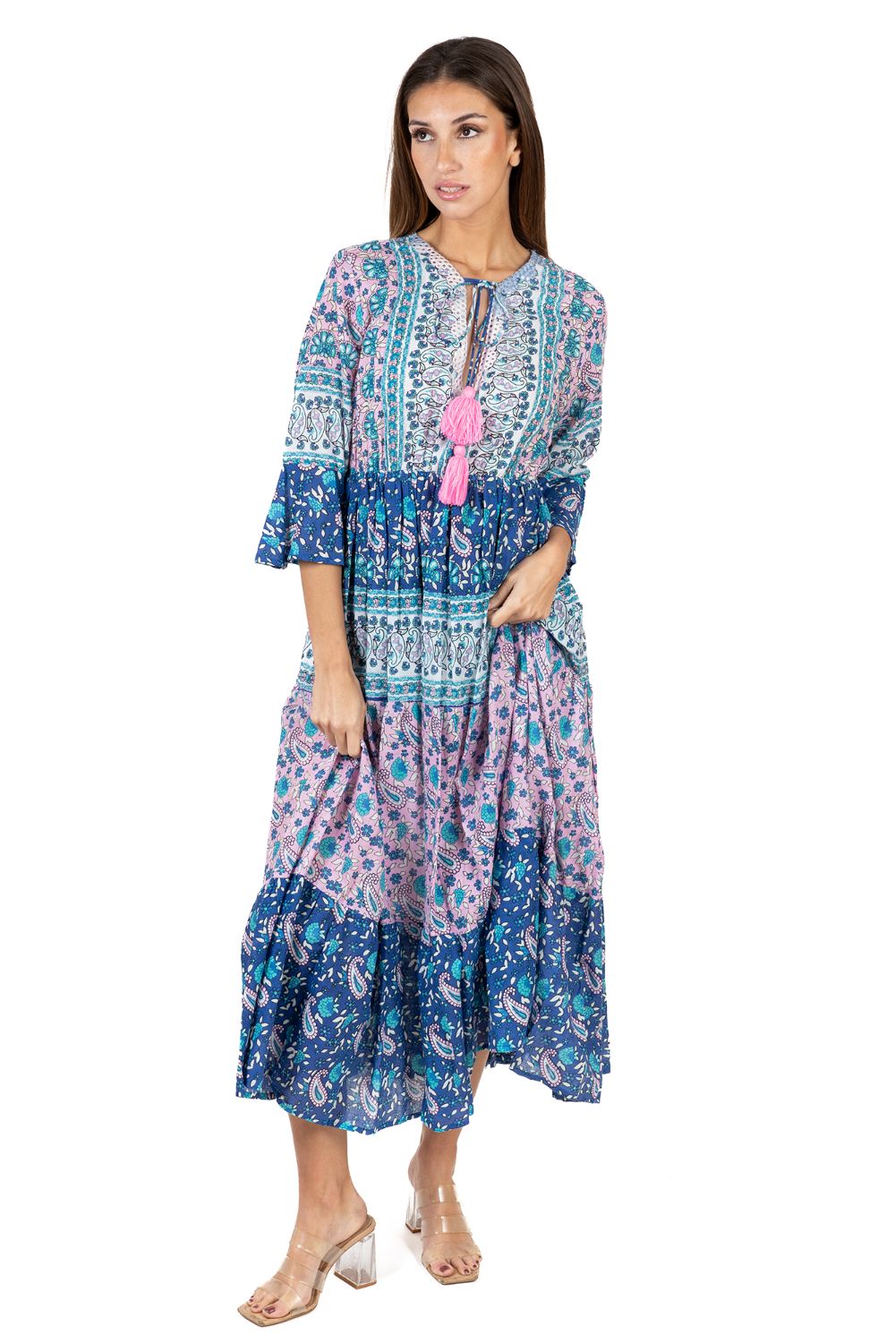 Maxi Boho Dài Tay Kết Cườm Cotton Isla Bonita, chất liệu cotton cao cấp, mềm mại, nổi bật phần ngực trước kết cườm sang trọng. Họa tiết thổ cẩm độc đáo. Phom suông. Dài Đầm