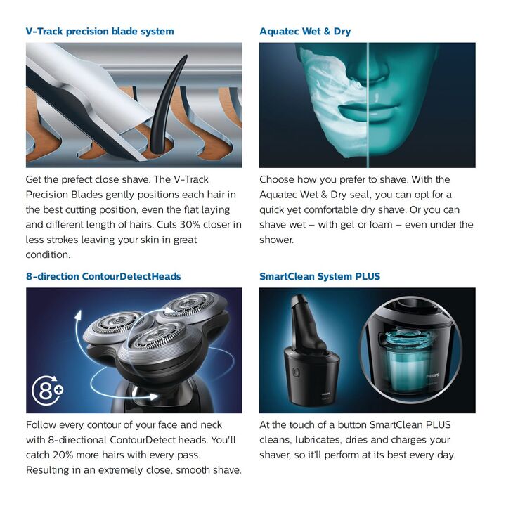 - Đầu cạo Contour Detect linh hoạt theo 8 hướng có thể tự do di chuyển theo 8 hướng khác nhau, đảm bảo tiếp xúc sát với da giúp bạn cạo râu nhanh và sát kể cả ở vùng cổ và quai hàm. Hệ thống hai lưỡi lưỡi cạo MultiPrecision và Super Lift & Cut Action có các đầu cạo được thiết kế lượn tròn trượt êm ái trên khuôn mặt. Với công nghệ nâng và cắt, lưỡi thứ nhất kéo râu từ gốc và lưỡi thứ hai sẽ cắt. Vì lưỡi dao bên trong không chạm trực tiếp vào da nên bạn có thể cạo sâu mà không làm tổn thương da. - Hệ thống hai lưỡi lưỡi cạo MultiPrecision và Super Lift & Cut Action của chúng tôi có các đầu cạo được thiết kế lượn tròn trượt êm ái trên khuôn mặt, tăng khả năng cạo lên đến 20% so với lưỡi cạo râu thông thường. Lưỡi dao chính xác V – Track Precision mang mọi sợi tóc vào vị trí tối ưu.