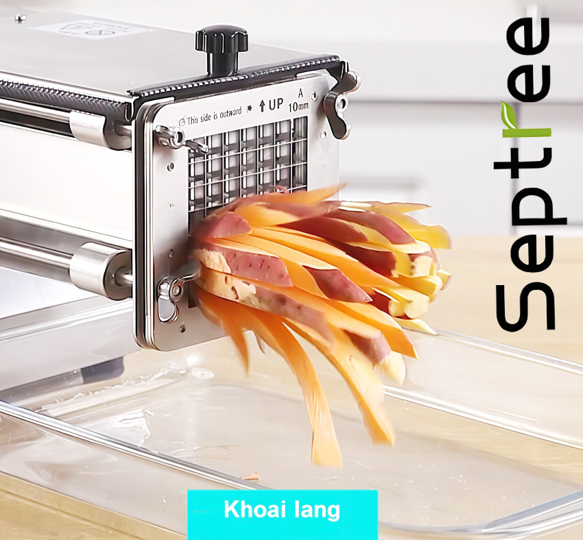 - Kinh doanh khoai chiên cùng với các món đồ ăn vặt, gà rán tuy không phải là mới nhưng chưa bao giờ bị bão hòa, ngược lại còn đem đến thu nhập cao bởi đây vẫn là món ăn vặt khoái khẩu, thơm ngon, hấp dẫn của giới trẻ. Để giúp công đoạn cắt khoai tại các cơ sở kinh doanh trở nên nhanh gọn, tiết kiệm thời gian, công sức. Giới thiệu máy cắt khoai tây, khoai lang và các loại củ kiểu Pháp chuyên nghiệp Septree T1000. Sản phẩm dùng để cắt khoai tây, khoai lang, cà rốt, su hào, dưa chuột…thành sợi vuông sợi dài, năng suất đạt từ 216– 250kg/ giờ.