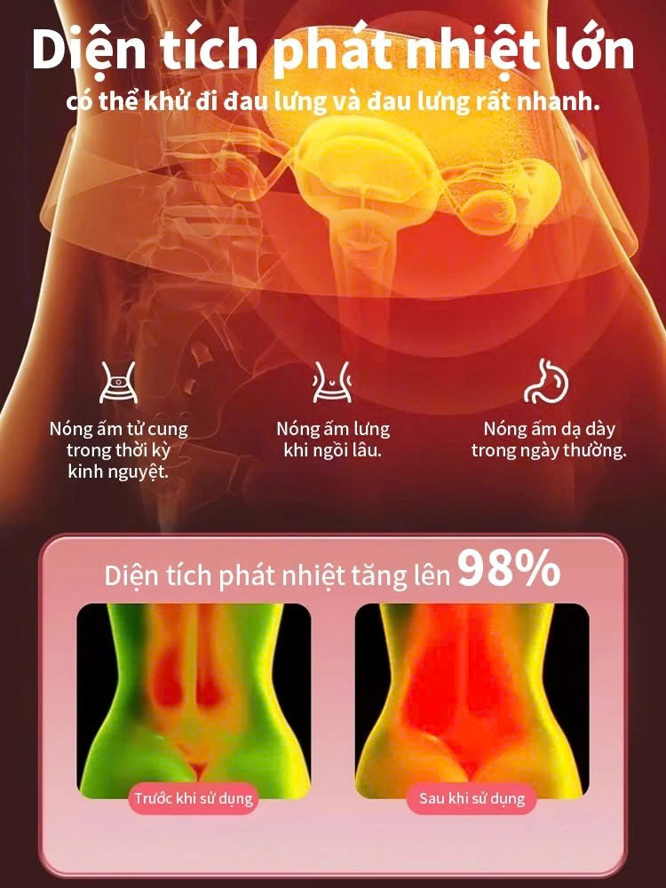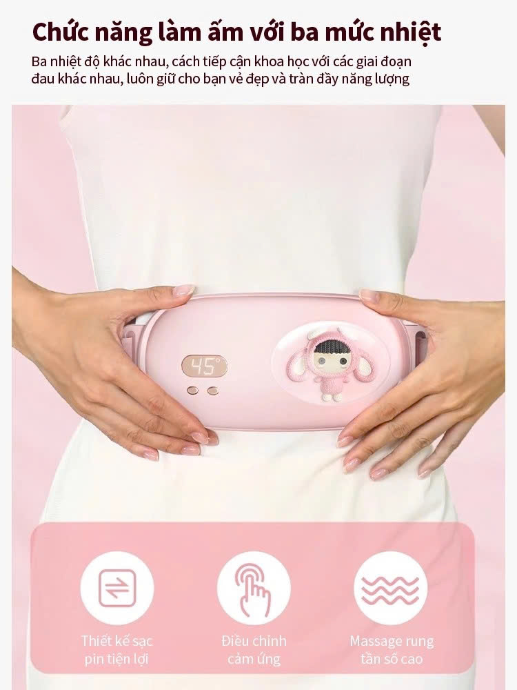 ƯU ĐIỂM: Cải thiện tình trạng đau bụng trước và trong kỳ kinh, điều chỉnh chu kì kinh ổn định. Dây đeo hỗ trợ đàn hồi giữ cho cột sống đứng yên, bảo vệ an toàn cho vòng eo. Máy Massage Làm Ấm Bụng làm tử cung giảm cơn đau hiệu quả . Tăng cường sự lưu thông tuần hoàn máu Giảm đau mỏi vùng xương chậu, bụng dưới, lưng, ngực Cải thiện chức năng sinh lý Nguyên lý nén nóng hồng ngoại xa, làm ấm tử cung, eo, dạ dày, bụng, v. v. Nhiệt độ có thể điều chỉnh, ấm nhưng không nóng, ba mức nhiệt độ: 40 °C - 50 °C - 60 °C Sử dụng dây sưởi bằng sợi carbon, làm nóng nhanh, an toàn. Chất liệu thân thiện với da, mềm mại và thoáng khí, không thấm nước, an toàn chống giật Chống xước;chống thấm;mềm mại thoáng khí