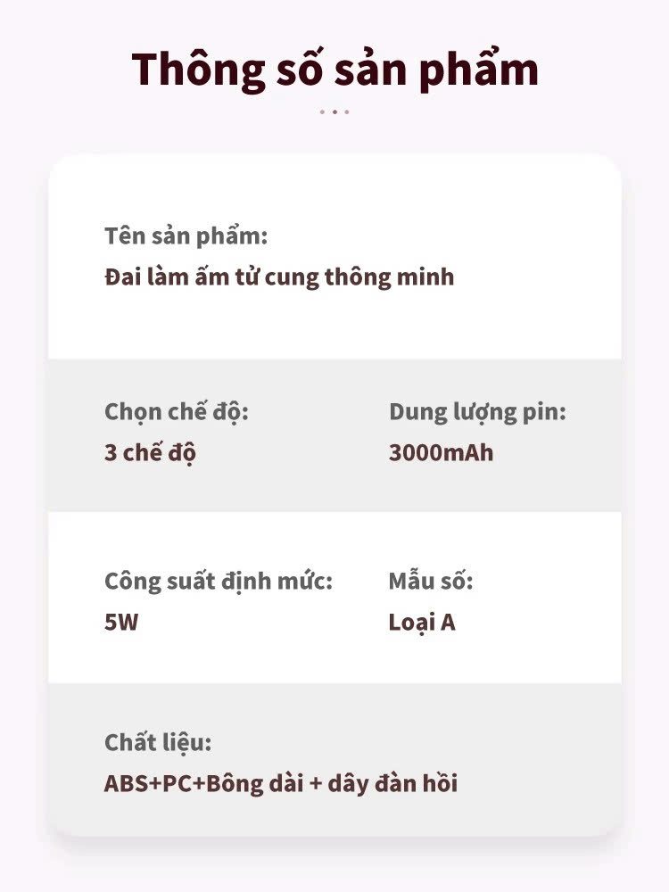 ĐẶC ĐIỂM SẢN PHẨM Đai gồm có 3 mức nhiệt độ (40 độ C giữ ấm hàng ngày, 50 độ C chăm sóc kinh nguyệt, 60 độ C giúp giảm đau bụng khi đến tháng) Dây đai co giãn và được tuỳ chỉnh rộng nhỏ theo vòng eo khi dùng, Chốt cài dây chắc chắn. Mặt vải phần tiếp xúc với bụng mềm mịn, không gây bỏng rát và tạo cảm giác thoải mái Đai có 3 chế độ rung massage (F1 rung liên tục, F2 rung/ngừng nhanh, F3 rung/ngừng chậm) Thiết kế nhỏ gọn nhẹ tiện lợi. Nên dễ dàng đem đi mọi lúc khi cần. Sản phẩm nhỏ gọn, dễ dàng sử dụng mọi lúc, mọi nơi Sản phẩm phù hợp để mang đi làm quà tặng