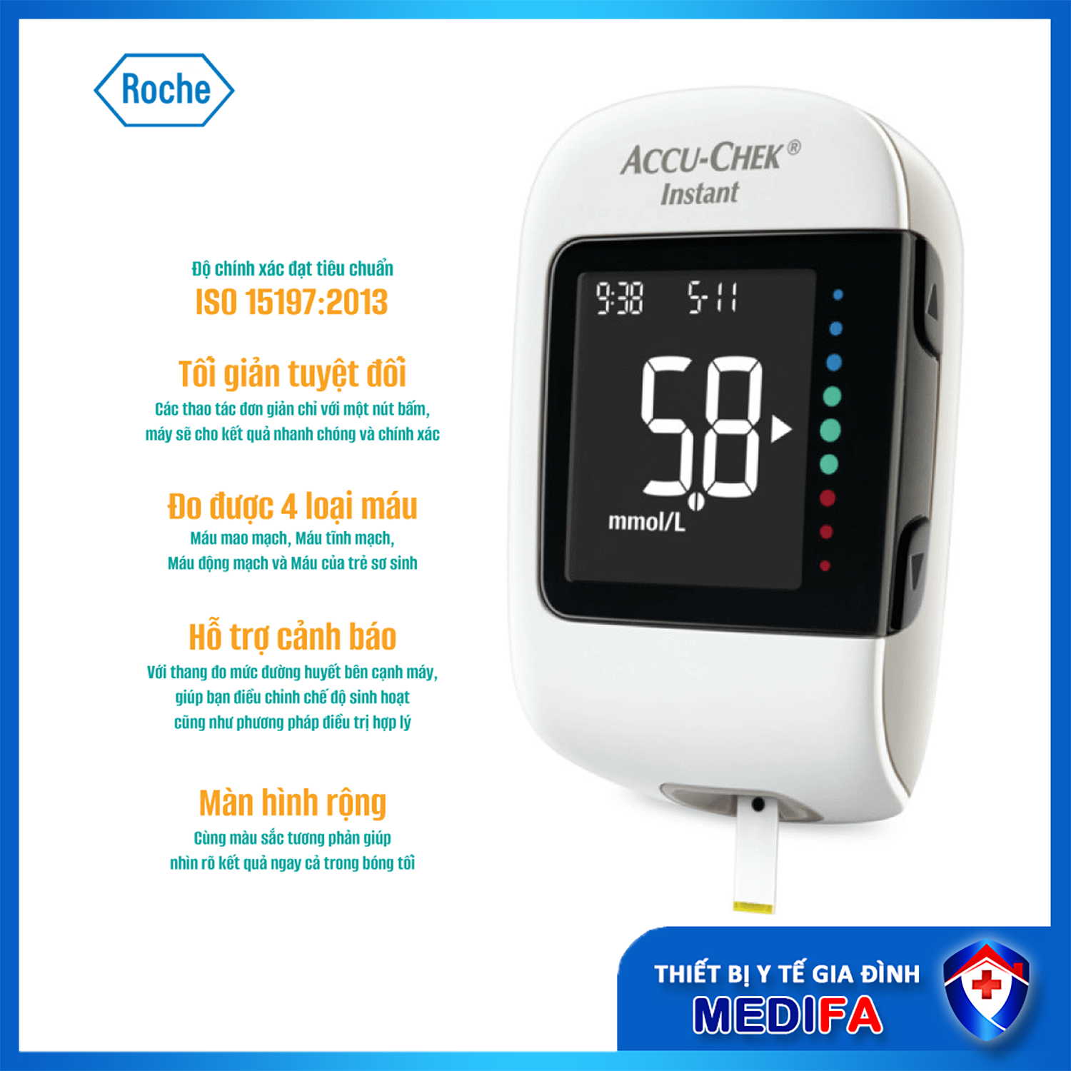 - Độ chính xác của máy đo đường huyết Accu-Chek Instant được chứng minh qua tiêu chuẩn ISO 15197: 2013 về các hệ thống theo dõi glucose in vitro.