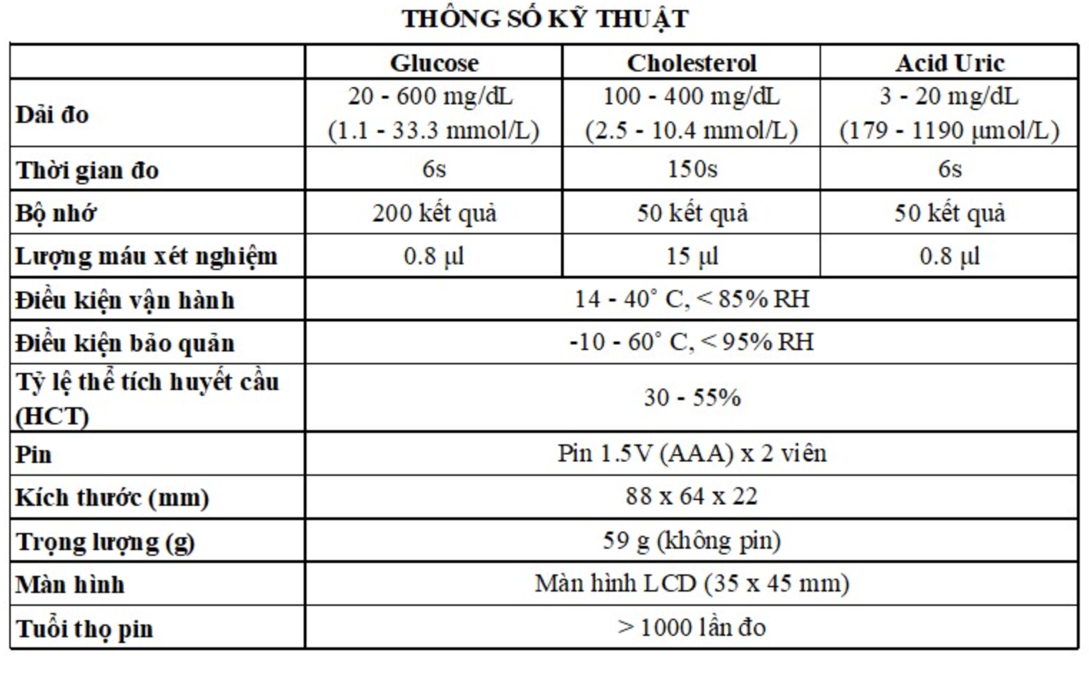 - Xuất xứ: Taiwan Thông số kỹ thuật – Nguyên tắc đo: Cảm biến sinh học trên điện cực. – Xác định kích cỡ: huyết thanh – Mẫu máu thử: máu mao mạch toàn phần – Thời gian thử: khoảng 6 giây ( Glucose ), 6 giây ( Acid Uric ), 150 giây (Cholesterol toàn phần ) – Phạm vi thử: • Glucose 20- 600mg/dL ( 1.1 – 33.3 mmol/l ) • Acid Uric 3 – 20mg/dL (0.18 – 1.19 mmol/l ) • Cholesterol toàn phần 100 – 400 mg/dL ( 2.5 – 10.4 mmol/l ) – Lượng máu: • Glucose & Acid Uric : ≥ 0.8 µl • Cholesterol : ≥ 15 µl – Dải huyết học: 30% – 55% ( Glucose, Acid Uric và Cholesterol toàn phần ) – Điều kiện bảo quản que: 14°C – 40°C ( 57°F – 104°F ) – Nhiệt độ vận hành: -10°C – 60°C ( 14°F – 104°F ) – Độ ẩm liên quan: < 95% – Bộ nhớ: • Glucose: 200 lần • Cholesterol và Acid Uric: 50 lần Khách có nhu cầu video hướng dẫn sử dụng chat với shop cung cấp