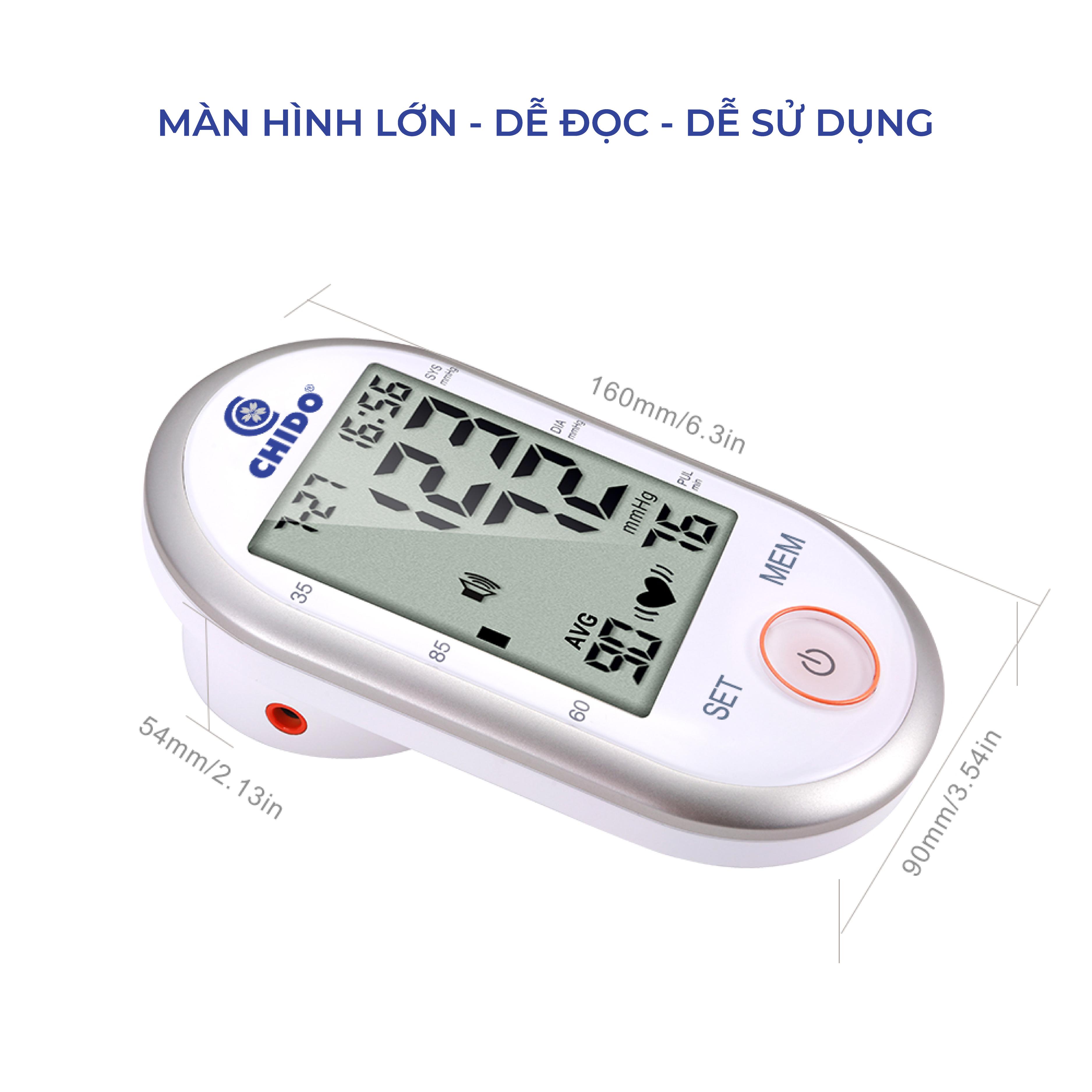 - Nhanh, chính xác Với công nghệ đo dao động, máy đo huyết áp điện tử Chido cho kết quả đo chỉ sau khoảng 30-40s với độ chính xác cao, sai số chỉ là ±2 mmHg. - Dễ dàng sử dụng với mọi lứa tuổi Chỉ sau 2 thao tác là quấn vòng bít và nhấn nút START là bạn có thể đo được huyết áp, nhịp tim. Tính năng tự động giúp cho các bác trung niên, cao tuổi cũng có thể tự thực hiện đo huyết áp tại nhà. Đây cũng là món quà sức khỏe vô cùng tuyệt vời để tặng cha mẹ! - Bộ nhớ thông minh Bộ nhớ của Máy đo huyết áp điện tử Chido có khả năng lưu trữ đến 90 kết quả đo khác nhau. Kết quả đó sẽ lưu lại các thông tin như ngày, giờ, chỉ số, trung bình 3 lần đo gần nhất, giúp bạn có thể theo dõi, kiểm soát được huyết áp trong thời gian dài Thông số kỹ thuật: