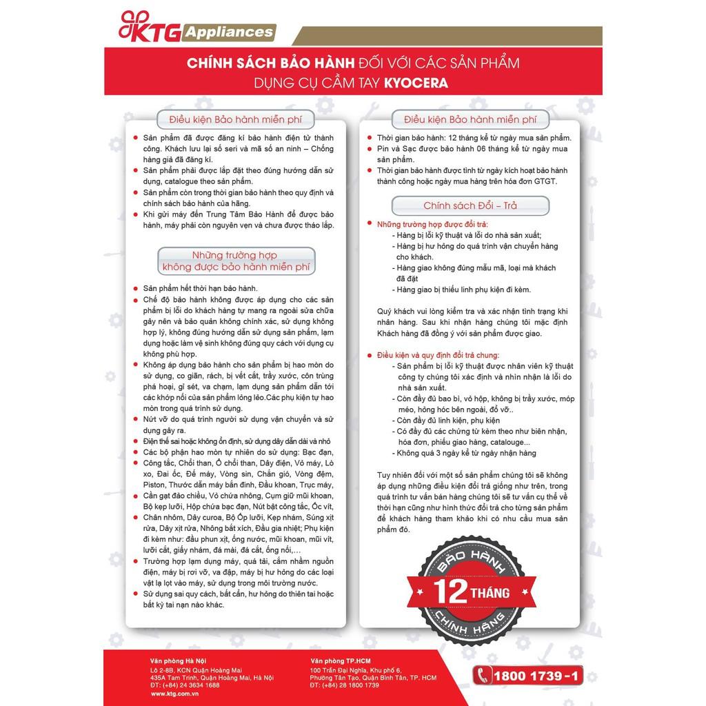 - Cách sử dụng: Bạn chỉ cần đứng yên một chỗ, thao tác trực tiếp thông qua các phím. Sau đó trỏ tia laser đến vị trí bạn cần đo kết quả sau vài giây sẽ lập tức được cập nhật trên màn hình LCD. Ngoài ra, Máy đo khoảng cách tia laser RYOBI – LDM-410 cũng cho phép lưu trữ nhiều kết quả đo để phục vụ cho công việc. THÔNG TIN THƯƠNG HIỆU: Kyocera là một tập đoàn của Nhật Bản được thành lập năm 1959 tại Kyoto. Tập Đoàn Kyocera có hơn 298 công ty trên toàn thế giới và hoạt động kinh doanh trong nhiều ngành: thiết bị công nghiệp và phụ tùng ôtô, bán dẫn, thiết bị điện tử, thiết bị văn phòng, dụng cụ nhà bếp. Năm 2018 Kyocera mua lại thương hiệu dụng cụ điện cầm tay Ryobi và triển khai ngành hàng dụng cụ điện cầm tay. Ryobi là một trong những thương hiệu dụng cụ điện cầm tay hàng đầu tại Nhật với thế mạnh đa dạng sản phẩm và chiếm thị phần cao tại thị trường Nhật. Với tầm nhìn và phát triển, KTG Appliances đã chính thức là Nhà Phân phối chiến lược thương hiệu và sản phẩm Kyocera tại Việt Nam.