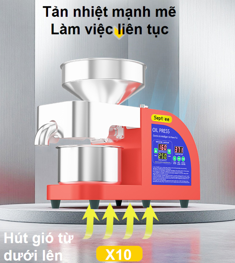 - Máy ép dầu thực vật công nghiệp Septree X10 với tính năng ưu việt, giúp bạn tự tay mình làm ra những chai dầu vàng óng, nguyên chất 100% từ những nguyên liệu hữu cơ: Lạc (đậu phộng), vừng (mè), dừa, hướng dương, đậu nành,… Máy ép dầu Septree X10 là sản phẩm được các đầu bếp lựa chọn nhiều nhất hiện nay, bởi tính năng mang lại cho người sử nguồn thực phẩm sạch, an toàn cho sức khỏe.