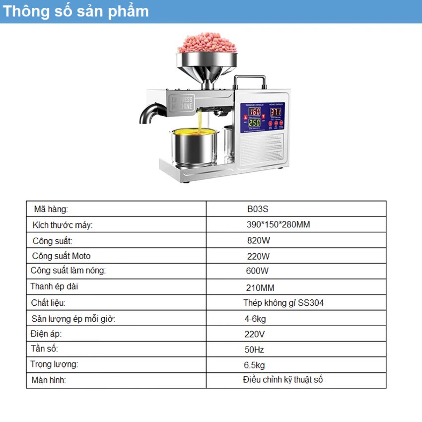 - Máy ép dầu thực vật gia đình Aosida - B03S với tính năng ưu việt, giúp bạn tự tay mình làm ra những chai dầu vàng óng, nguyên chất 100% từ những nguyên liệu hữu cơ: Lạc (đậu phộng), vừng (mè), dừa, hướng dương, đậu nành,… Máy ép dầu Aosida - B03S là sản phẩm được người tiêu dùng lựa chọn nhiều nhất hiện nay, bởi tính năng mang lại cho người sử nguồn thực phẩm sạch, an toàn cho sức khỏe. Máy ép dầu thực vật gia đình giúp tiết kiệm chi phí