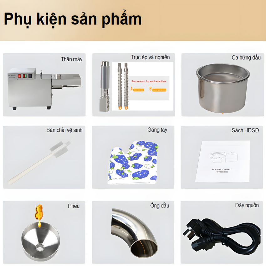 - Bộ sản phẩm bao gồm: 1 thân máy, 1 ca đựng dầu ăn, 1 dây nguồn, 1 lưới lọc, 1 ống nguyên liệu, 1 găng tay và chổi vệ sinh, 1 sách HDSD