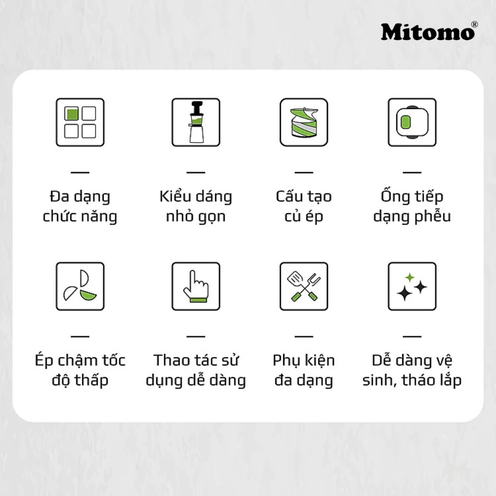 - Dễ dàng vệ sinh máy, tiện lợi mang theo Tính năng nổi bật của máy ép trái cây, máy ép chậm Mitomo chính hãng